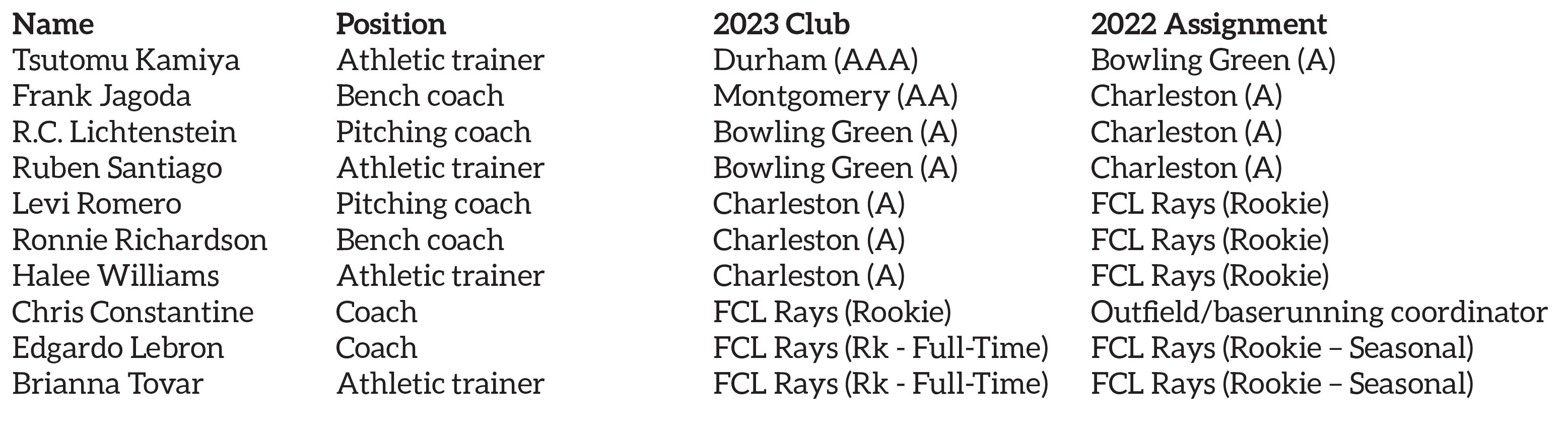ST. PETERSBURG, Fla.—The Tampa Bay Rays have named the minor league on-field coaching and medical staffs for the 2023 season. Below are the organizational changes for minor league managerial roles: