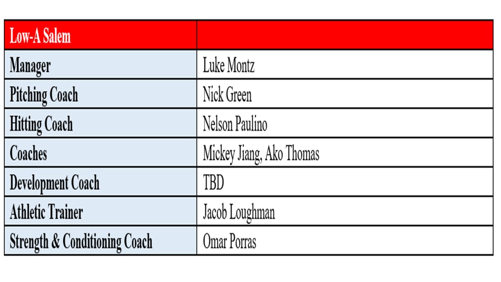 Luke Montz enters his second season managing Salem after serving in the same role for Short-A Lowell (2019-20) and serving as a coaching assistant for Double-A Portland (2018). In 2020 , Montz led the Red Sox to the Low-A North Division title and a 71-49 - record in the regular season. Veteran hitting coach Nelson Paulino will return to the staff in his 25th season coaching in the organization (1998-2022 ), having previously worked with Salem in 2013, from 2016-18, and from 2020-21. Nick Green, who joined the Red Sox organization in 2015, returns for his second season as Salem’s Pitching Coach after spending three seasons as Pitching Coach for Lowell (2018-20).
