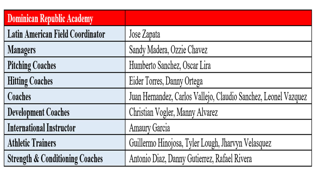 Returning for a second season at the academy as International Instructor is Amaury Garcia, who previously spent 12 years with the Washington Nationals organization, including serving as Hitting Coach for Single-A Hagerstown (2016-20). Guillermo Hinojosa will return for his 13th season as Athletic Trainer, while Jharvyn Velazquez will return for his third. Joining the staff is Athletic Trainer Tyler Lough, who served in that same capacity at the Fort Myers complex in 2021. Antonio Diaz and Danny Gutierrez will resume their roles as strength and conditioning coaches at the academy and will be joined by Rafael Rivera. Rivera previously worked in the Dominican Summer League as an athletic trainer in the Cardinals and Pirates organizations, also serving as an assistant strength and conditioning coach for los Toros del Este in the winter.