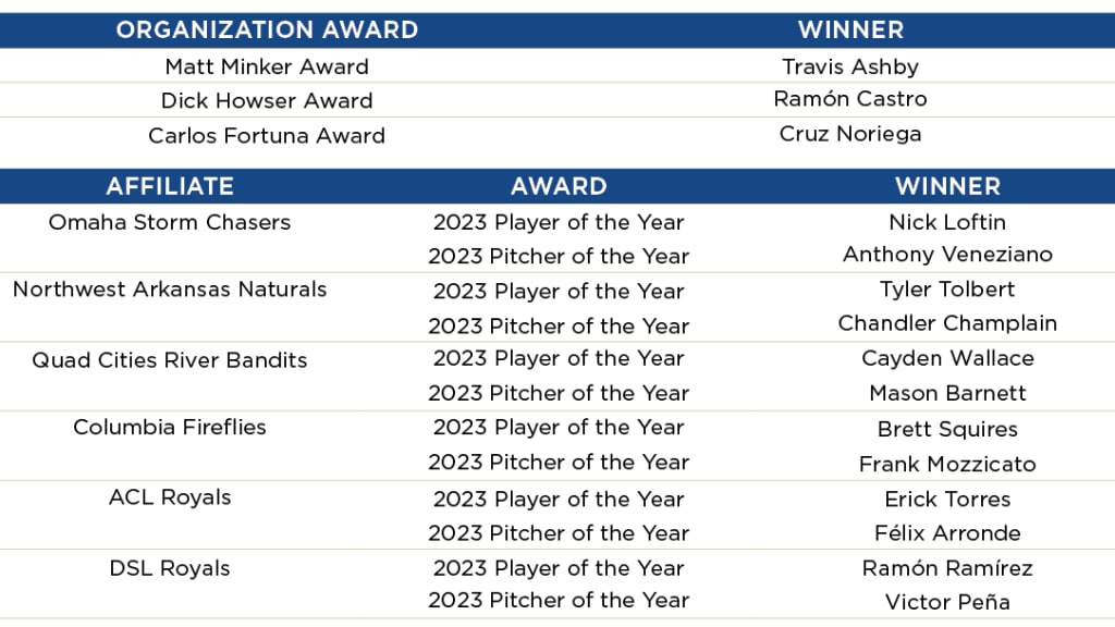 SURPRISE, Ariz.—The Kansas City Royals today named their 2023 Organization Award winners and their Players and Pitchers of the Year for each minor league affiliate.