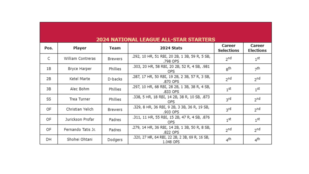 The second phase of voting, which gave fans the opportunity to vote for the starting position players at the 2024 Midsummer Classic, featured the top two vote-getters at each position (and the top six outfielders in the NL; next four outfielders in the AL after Judge) in each League based on vote totals from Phase 1, which ran from June 5th-27th.