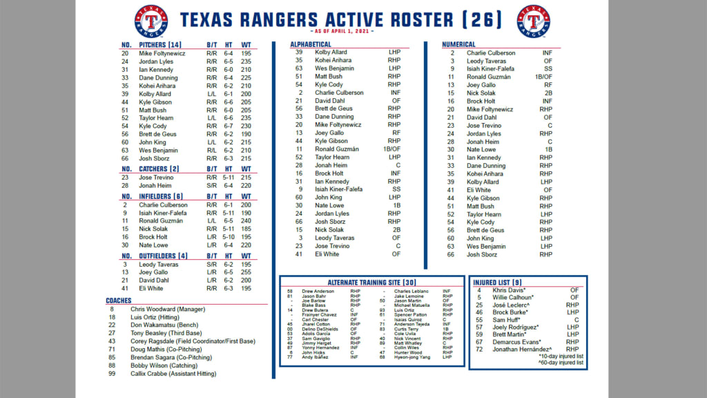 Arlington, Texas – The Texas Rangers today announced the following transactions to reach the 26-man opening day roster limit to begin the 2021 season.