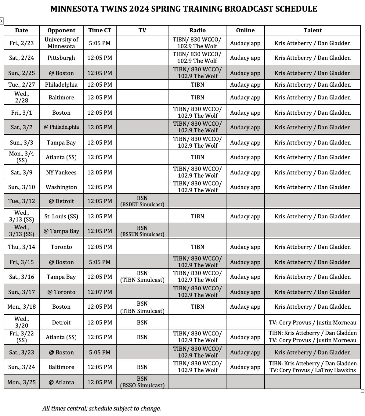 MINNEAPOLIS-ST. PAUL, MN – With camp now officially underway, the defending American League Central Division Champion Minnesota Twins, in conjunction with partners Bally Sports North, Audacy’s News Talk 830 WCCO (WCCO-AM) and 102.9 The Wolf (KMNB-FM), and the Treasure Island Baseball Network (TIBN), today announced the club’s 24-game, 2024 Spring Training broadcast schedule.