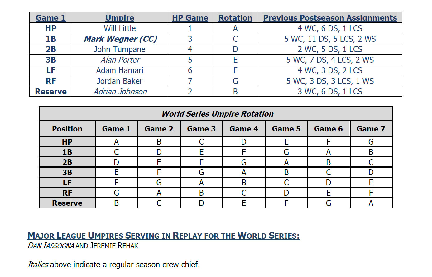 Placing seven umpires on the World Series crew allows for distinct home plate assignments in a potential seven-game series, with one umpire off the field in each game. Major League Umpires Jeremie Rehak and regular season crew chief Dan Iassogna have been assigned to Replay throughout the Fall Classic. Eight of the nine Major League Umpires assigned to the World Series worked the Division Series round of the 2025 Postseason, with Iassogna serving as a crew chief for the Wild Card Series. A complete listing of the World Series umpire rotation accompanies this press release.