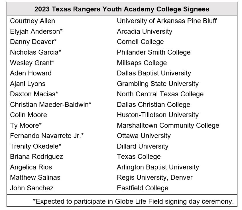 The Texas Rangers Youth Academy will hold its annual signing day ceremony for athletes continuing their playing careers at the collegiate level at 10 a.m., on Monday, July 24, at Globe Life Field.