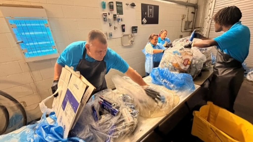 It starts with what fans experience on the concourse, where clearly marked recycling and waste receptacles are placed strategically throughout the ballpark. What happens next is what sets the operation apart. Every blue recycling bag collected during a game is transported to a centralized sorting room, where a dedicated team from Pritchard Industries manually separates its contents. Aluminum, plastics, and waste are sorted by hand, ensuring that recyclable materials are properly recovered and contamination is minimized.