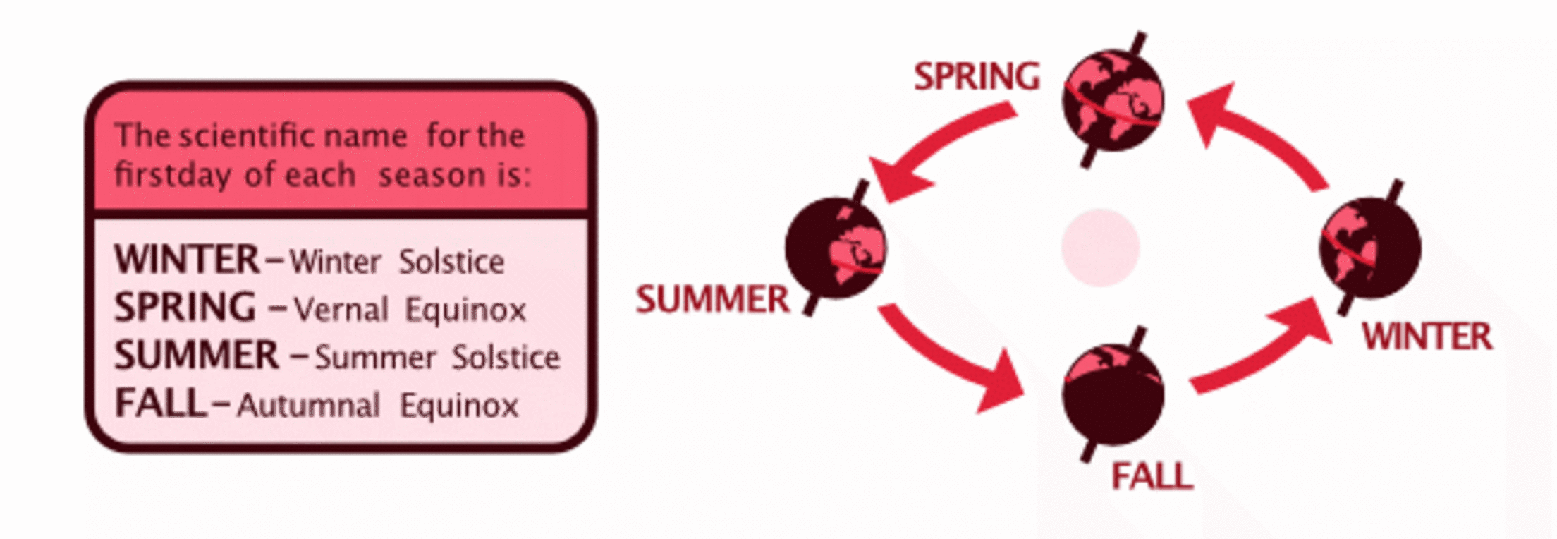 Throughout the course of a year, we experience 4 different seasons: winter, spring, summer, and fall. These seasons are caused from the earth’s tilt on its axis. (Earth sits at a 23.5º tilt.) Because of this tilt, we receive different amounts of sunshine or energy as the earth revolves around the sun. So during the winter, we in North America are facing away from the sun. Meanwhile, during the summer months, our side of the globe is facing the sun most directly. This impacts the amount of daylight we receive during each season and it impacts our temperatures.