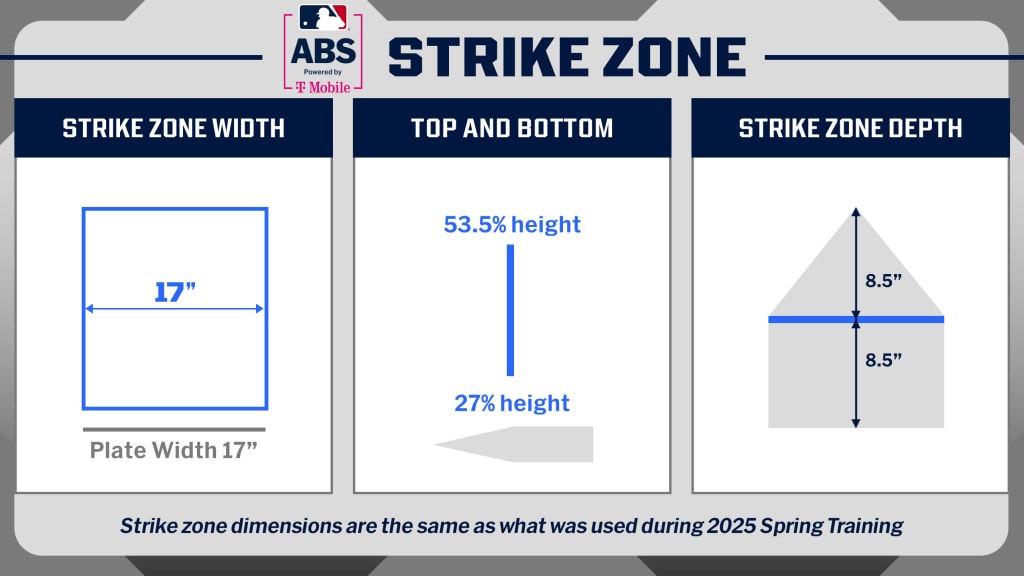 \n\n","providerName":"Twitter","providerUrl":"https://twitter.com","thumbnail_url":null,"type":"oembed","width":550,"contentType":"rich"},{"__typename":"Markdown","content":"Alas, installing a system of mirrors and light poles and projectors near the batter’s box would have been, um, a little intrusive.\n\nBy 1950, Branch Rickey’s Brooklyn Dodgers were using Spring Training to test out a General Electric-designed contraption that used mirrors and lenses to judge balls and strikes. It didn’t really work, but at least we got a cool photo of Jackie Robinson and Duke Snider checking it out.","type":"text"},{"__typename":"DynamicInclude","type":"dynamicinclude","body":"**ABS Challenge System, powered by T-Mobile** \n• Everything you need to know \n• [A visual guide to how ABS works](https://www.mlb.com/interactive/mlb-abs-system-explainer) \n• What does all the data mean \n• Players get strike zones measured \n• Player poll: Who'll be best at ABS challenges? \n• ABS Challenge Dashboard \n• ABS Challenge Leaderboard"},{"__typename":"Markdown","content":"Come 1960, legendary skipper Casey Stengel was noting that “they use radar and electronics for everything else; I don’t know why it can’t be done in baseball.” He was right… but just a few decades early.\n\nQuestec came along in 2001, PITCHfx in 2008, Statcast in 2015.\n\nToday, radar is all the rage. We can use it to track anything, including, yes, balls and strikes. So MLB began testing various iterations of ABS in independent and Minor League ball.\n\nFinally, here we are.\n\n* The 10 biggest storylines for MLB's first game with ball-strike challenges\n\nWe’ve attempted to answer all the questions you might have about how the ABS Challenge System functions and was formed. We’ve also looked at the Triple-A data to identify statistical trends associated with ABS. And we’ve unveiled a new Baseball Savant database that will be populated with all kinds of interesting statistical nuggets, revealing which teams and players prove particularly good at this.\n\nNow, with the Yankees and Giants set to begin the 2026 season on Wednesday Night ([8 p.m. ET on Netflix](https://www.mlb.com/news/yankees-giants-mlb-opening-night-game-on-netflix-date-time-matchup)), let’s take a broad look at five things baseball fans need to know about the ABS Challenge System’s expected impact on MLB.\n\n**1\\. The strike zone will be a little smaller.**\n\nThe ABS strike zone is two-dimensional and strictly rectangular. It is set in middle of home plate -- 17 inches across (just like home plate), with the height based on the batter’s height (53.5% of his height at the top and 27% of his height at the bottom).","type":"text"},{"__typename":"Image","caption":null,"contextualCaption":null,"contextualAspectRatio":null,"credit":null,"contentType":null,"format":"jpg","templateUrl":"https://img.mlbstatic.com/mlb-images/image/upload/{formatInstructions}/v1774467649/mlb/ampzl9jdzdv73ujdzb9l","type":"image"},{"__typename":"Markdown","content":"This is slightly different than the more rounded, human-ump-enforced zone of seasons past. The data shows us that the umpire-called zone has had a maximum height of 55.6% and a 24.2% minimum at the bottom.\n\nSo be it by umpire adjustment or challenges on close calls, we can expect a slightly tighter zone.\n\nThe change here won’t be dramatic, but you can expect to see a slightly reduced strikeout rate (22.2% of 2025 plate appearances ended in a strikeout, the eighth-highest mark of all-time) and a slight increase in walk rate (the 8.4% walk rate in 2025 was basically in the middle of the 7.6% low and 9.6% high observed in the last 70 years of MLB play).\n\nA less-lenient zone could impact pitchers like the Red Sox’s Ranger Suarez and the Diamondbacks’ Merrill Kelly, who rely on guile and chase. It could reward pitchers like the Twins’ Joe Ryan and the Mets’ Freddy Peralta, who are less-reliant on chase and more reliant on whiffs in the zone.\n\nOne other note here: How a player stands in the box impacts his perception of the zone. Because each player’s individual strike zone is measured by his height and not his specific stance, a batter who squats down a bit more will feel like the top and bottom of the zone are higher than he is accustomed to, while a batter who is more upright will feel like those boundaries are lower than he is used to.\n\n**2\\. There will be a new layer of strategy within MLB games.**\n\nTeams get two challenges per nine-inning game. They keep the ones they get right and lose the ones they get wrong.\n\nSo ideally, you would only challenge a call in the game’s highest-leverage moments. But of course, knowing which moments will prove to be high-leverage while in the course of a given game is an inexact science. Heck, sometimes the biggest pitches turn out to be in the first inning, not the ninth.\n\nStill, guardrails can be helpful. Some teams in the Minor Leagues imposed voluntary restraints, be it not allowing their players to issue challenges in the first inning or only letting catchers, not pitchers, issue challenge on the defensive side.","type":"text"},{"__typename":"Video","contentDate":"2026-03-22T16:46:12.594Z","preferredPlaybackScenarioURL({\"preferredPlaybacks\":\"mp4AvcPlayback\"})":"https://mlb-cuts-diamond.mlb.com/FORGE/2026/2026-03/22/48834c6f-12742caf-641d622e-csvm-diamondgcp-asset_1280x720_59_4000K.mp4","type":"video","description":"Jordan Walker sends his first homer of Spring Training to center field to put the Cardinals on the board after overturning strike 3 from an ABS Challenge","displayAsVideoGif":false,"duration":"00:00:28","slug":"jordan-walker-homers-after-abs-challenge","tags":[{"__typename":"InternalTag","slug":"season-2026","title":"Season 2026","type":"season"},{"__typename":"GameTag"},{"__typename":"PersonTag","slug":"playerid-691023","title":"Jordan Walker","person":{"__ref":"Person:691023"},"type":"player"},{"__typename":"TeamTag","s