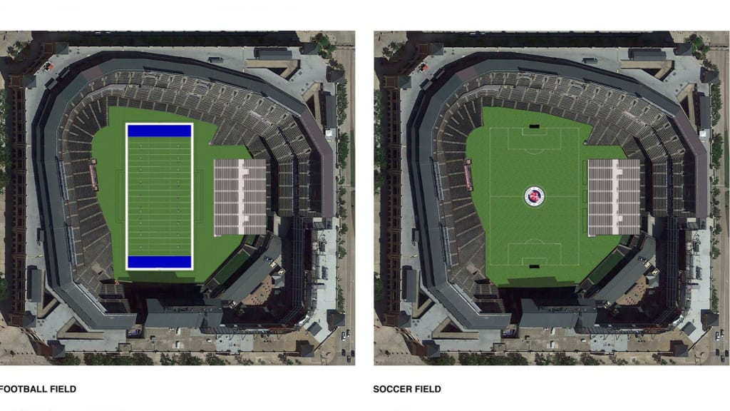 The football field and soccer pitch will be built to run north and south along what was the first base/right field side of the park. The third-base dugout and the lower 18 rows of the third-base seating bowl (approximately 6,000 total seats) will be removed to accommodate the north end of the field. The south end zone of the field will begin approximately 50 feet out from the front row of the Home Run Porch.