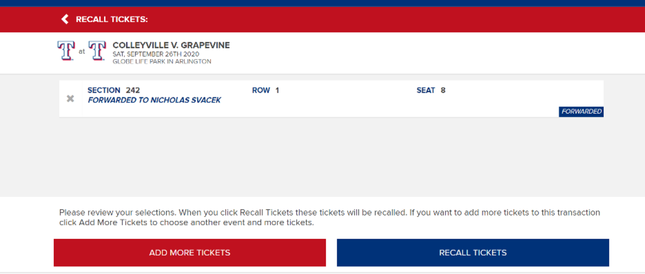 Now you can Recall previously forwarded tickets meaning you can pull tickets back in to your account to resell, forward to a different friend, or print to enter the game! To Recall a ticket: