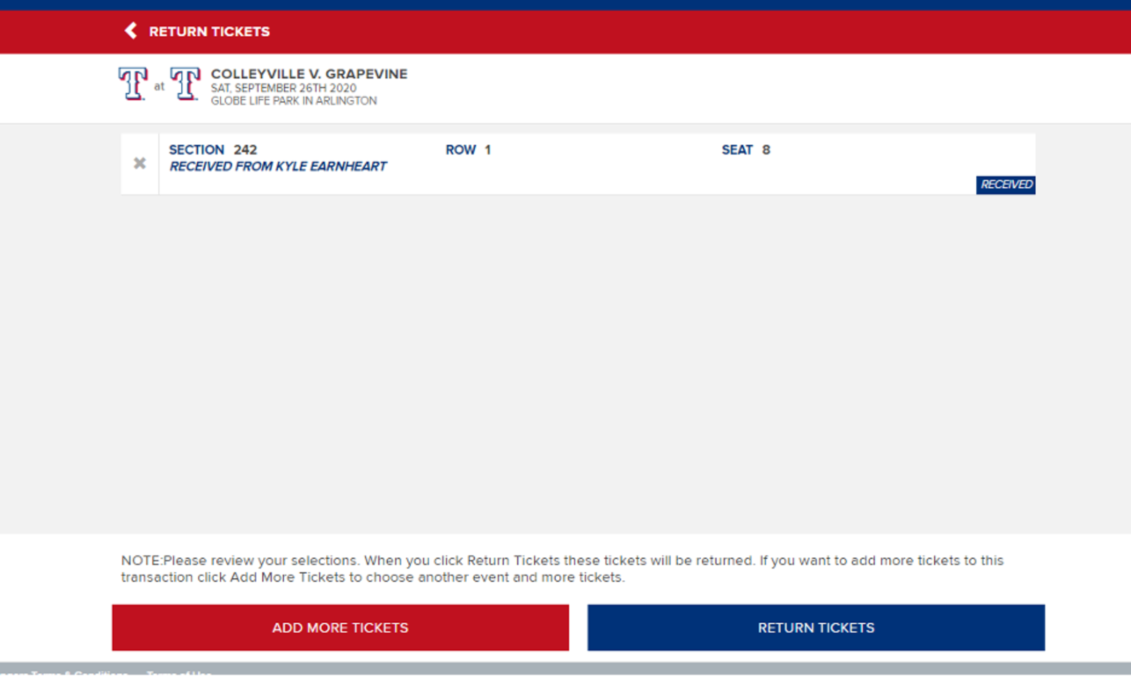 When tickets are forwarded to you, you will receive an email notifying you that you are the recipient of forwarded tickets. You can access your tickets through My Rangers Tickets, return you tickets to the sender, or send a thank you message to the sender.