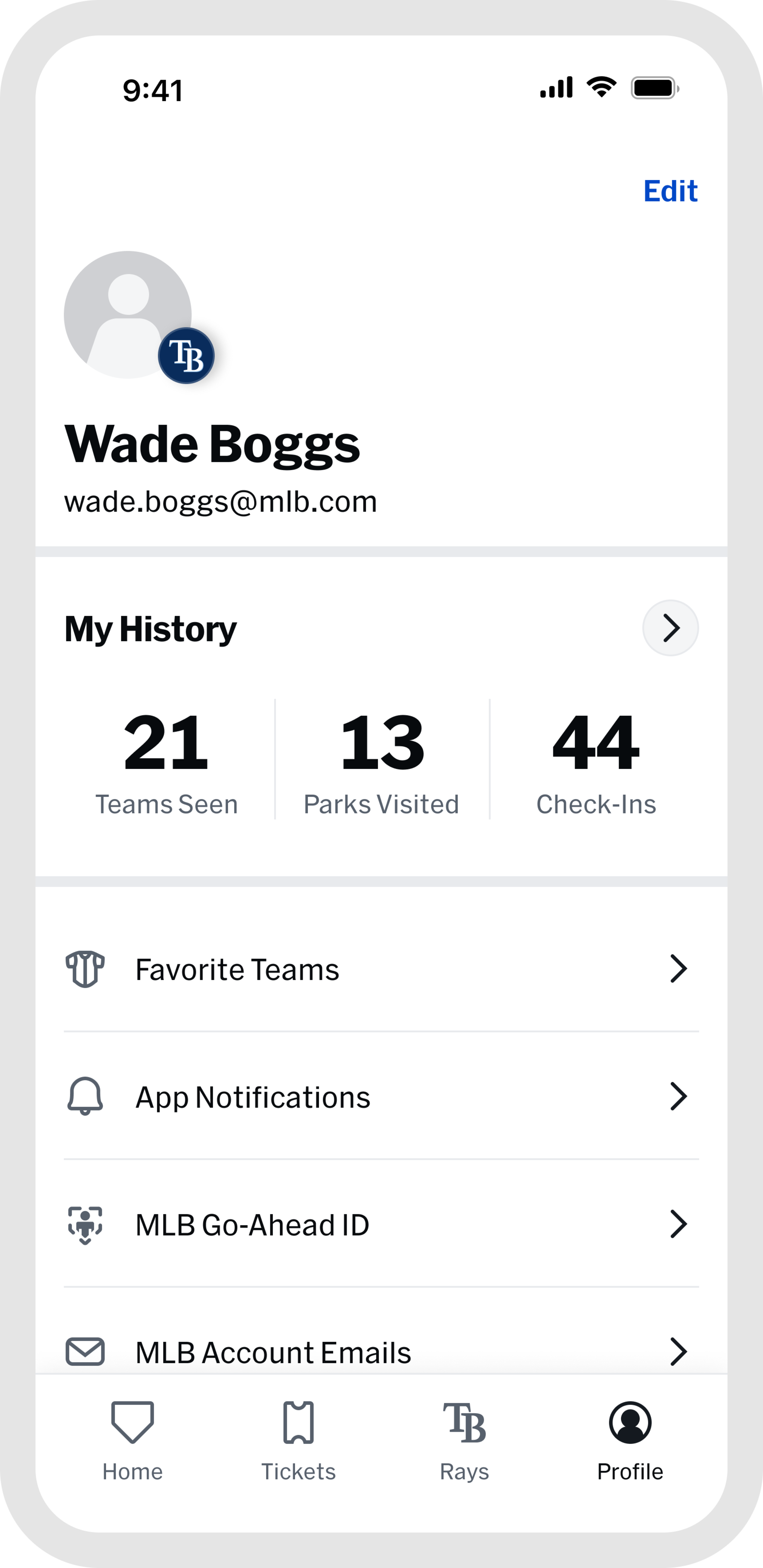 Once you arrive, the "Home" and "Rays" tabs become your go-to resource for venue details and features that enhance your gameday experience. Capture and preserve your ballpark memories by tapping "My History" within the "Profile" tab.