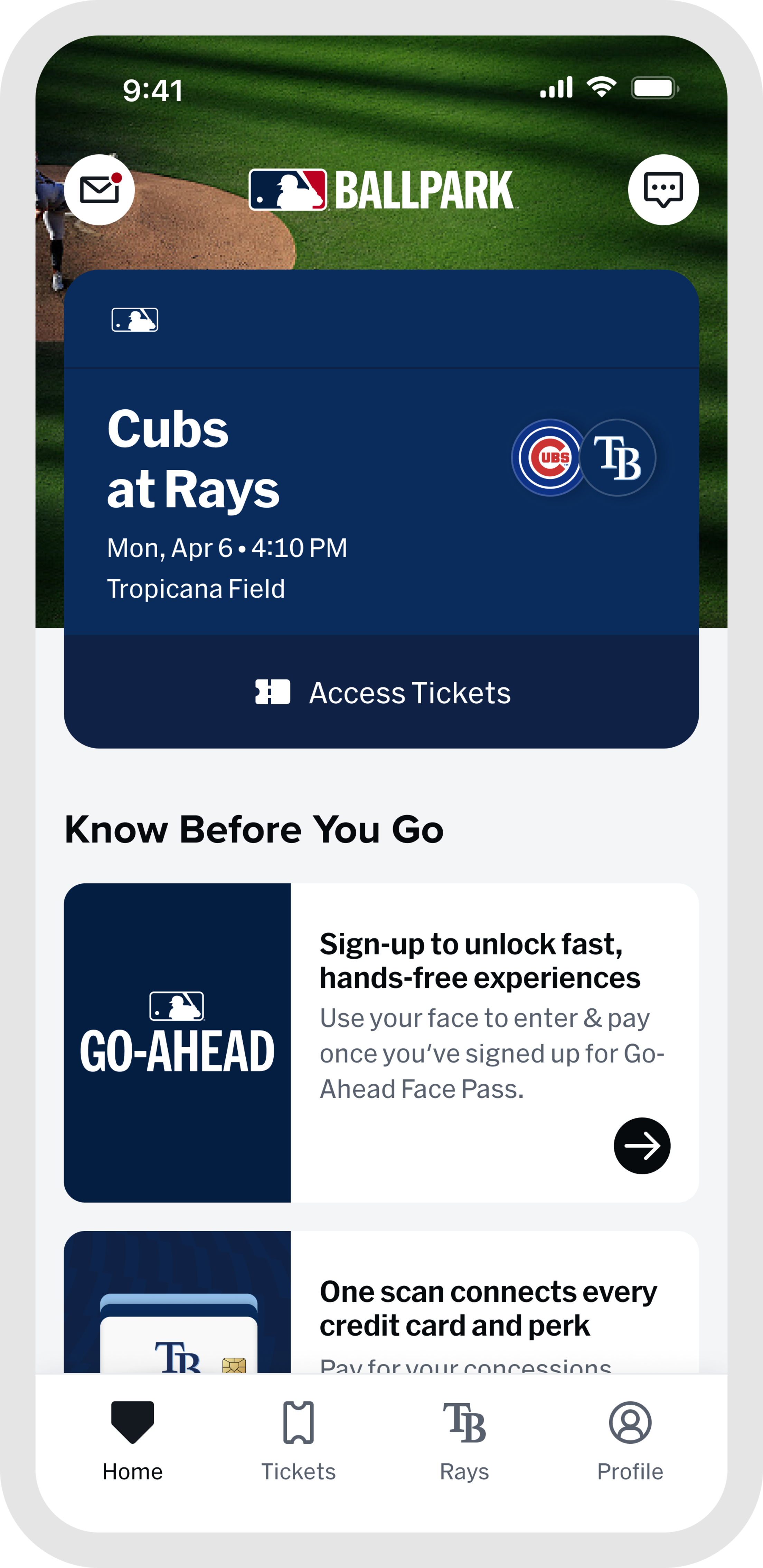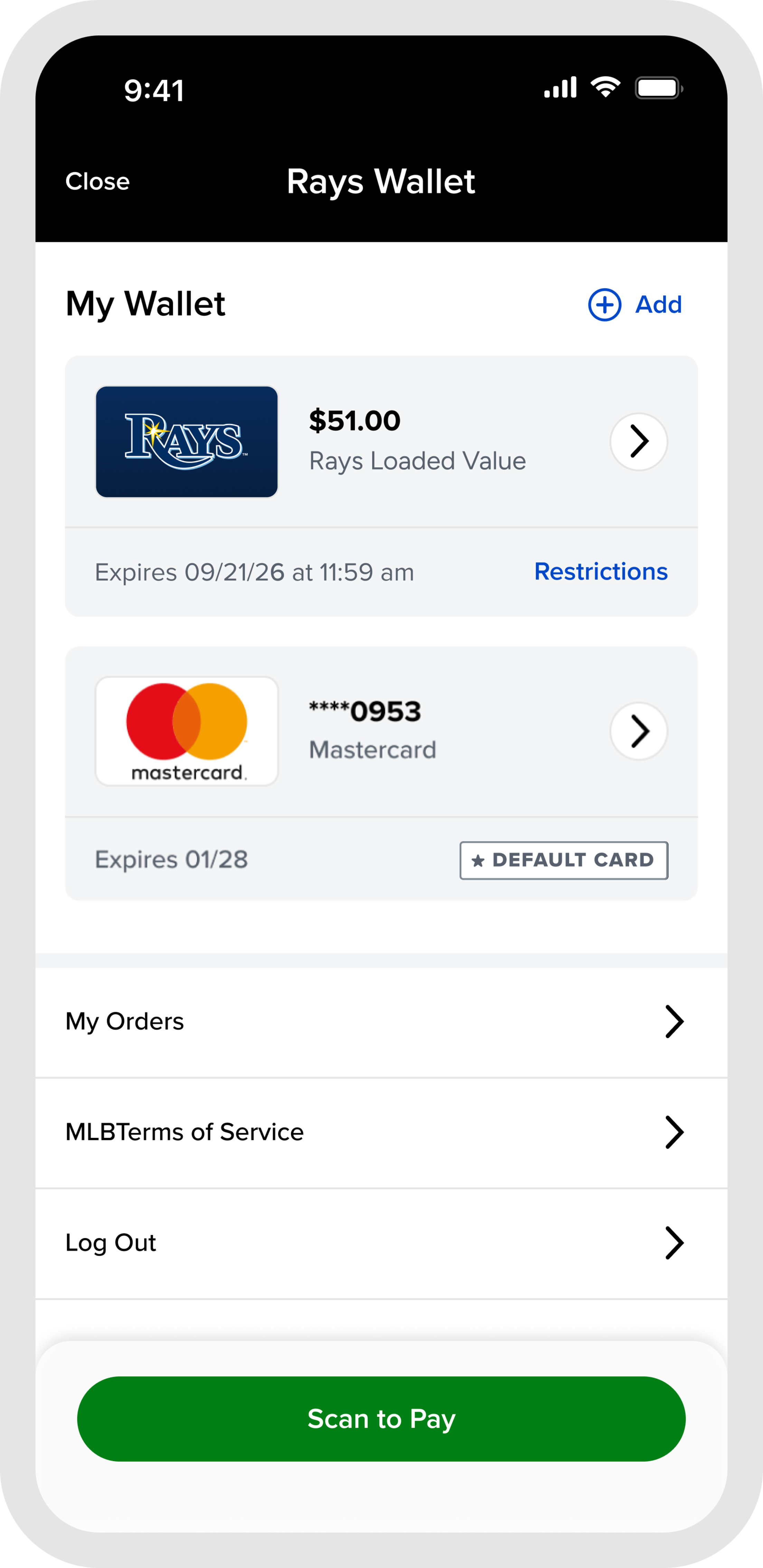 Rays Wallet provides a seamless way for fans to manage their ticket entitlements and concession credit in one centralized wallet experience. Rays Wallet is available to fans using the MLB Ballpark app at Tropicana Field concession and retail locations, some restrictions may apply based on the credit or discount. Please see Terms of Use and Privacy Policy for more information.