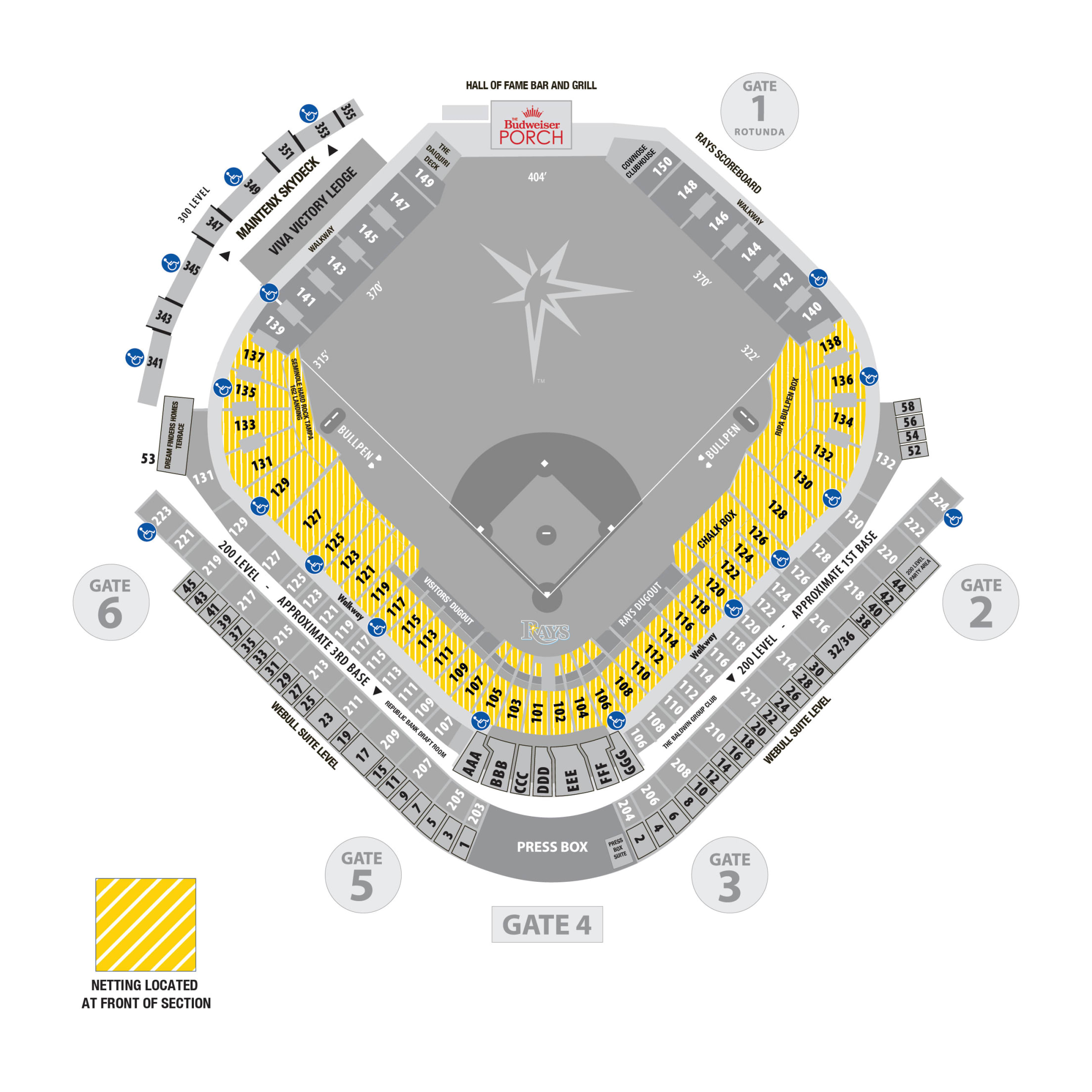 Please understand that it is not possible for a map to show the precise location of the netting and/or to what extent netting may or may not impact your view. In addition, regardless of the location of netting, fans in the sections listed above are still exposed to objects leaving the field of play, including bats and bat fragments, and thrown or batted balls; ticket holders assume all risk of injury. No seat in Tropicana Field is free from the risk of injury inherent in attending a live baseball game. For more information on netting coverage and seating options, please contact the Tampa Bay Rays Ticket Office at 1-888-FAN-RAYS.