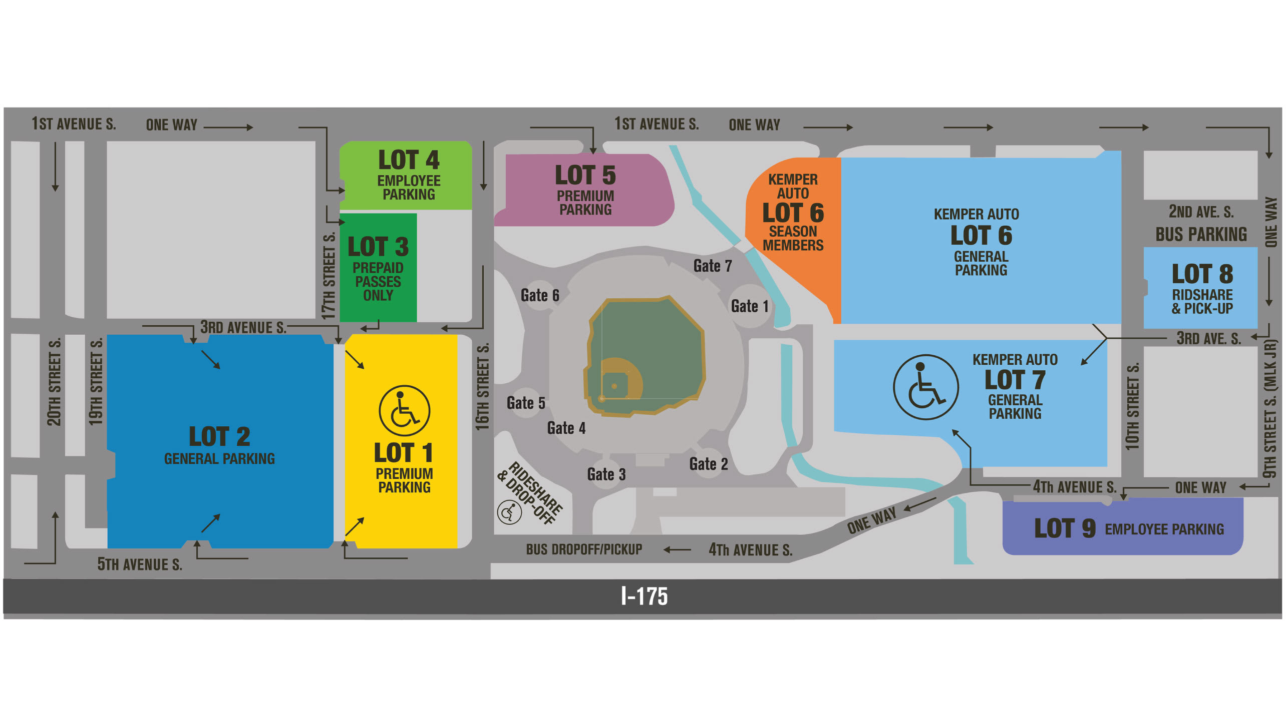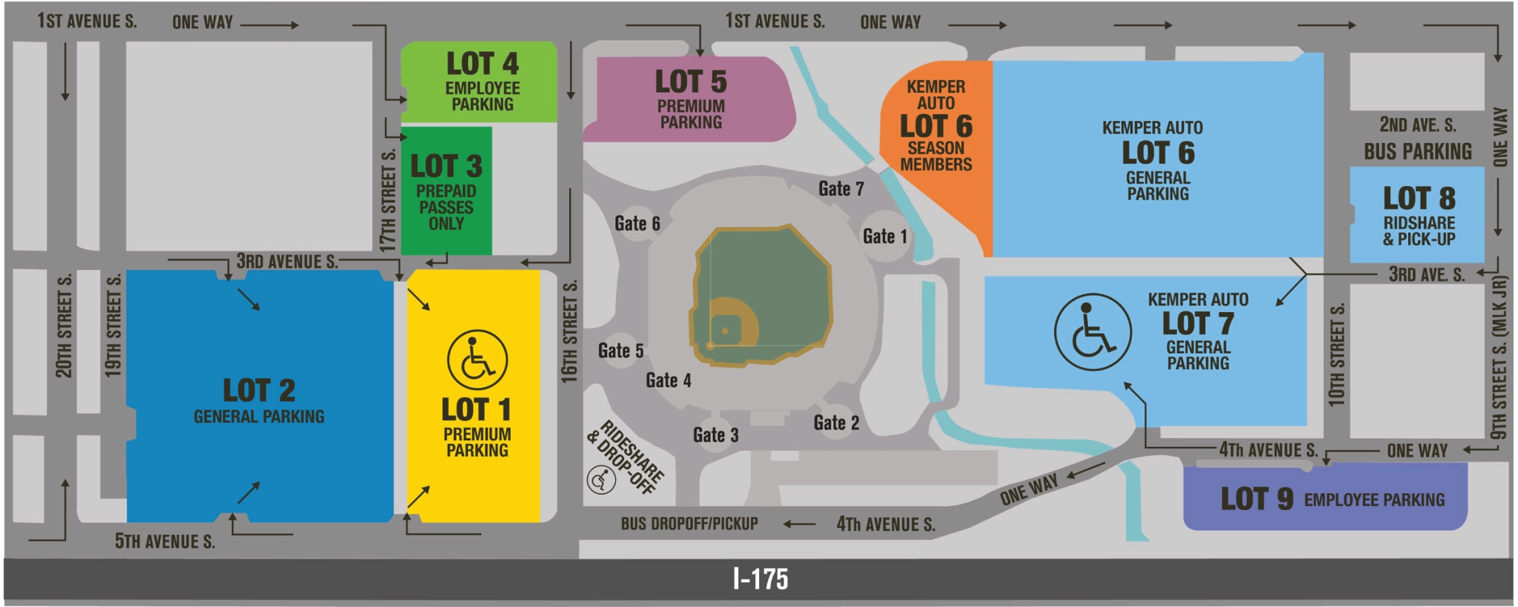 Lots 1 and 7 offer wheelchair accessible parking just outside the gates, with the majority of the spaces located in Lot 7. All wheelchair accessible parking is van-accessible. Enter Lot 7 from either 3rd Ave South or 4th Ave South. Wheelchair accessible parking is subject to availability.