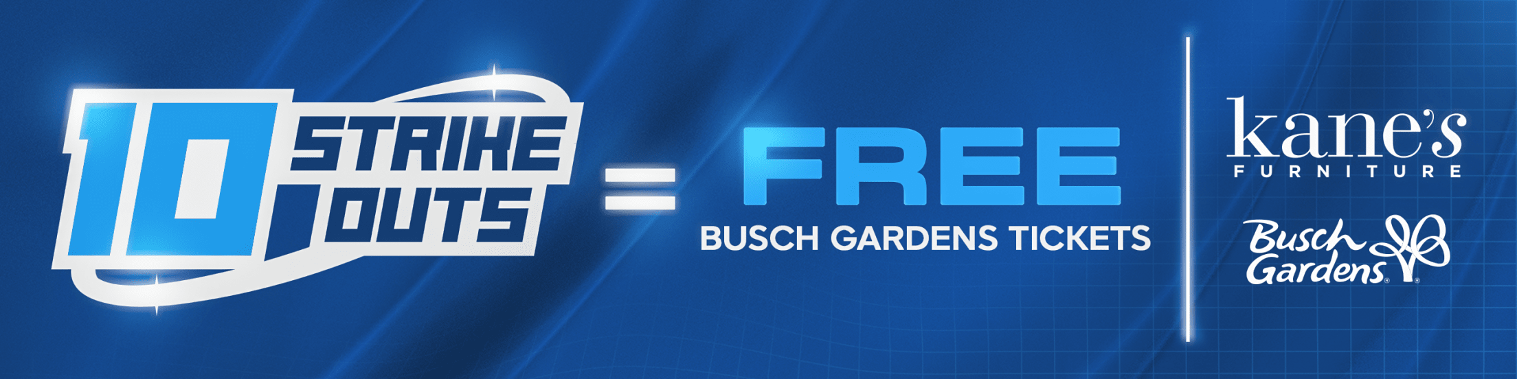 To receive your FREE Busch Gardens Ticket, bring your printed or digital web voucher from KanesStrikeout.com to any Kane's Furniture store within five days of the 10 Strikeout regular season home game.