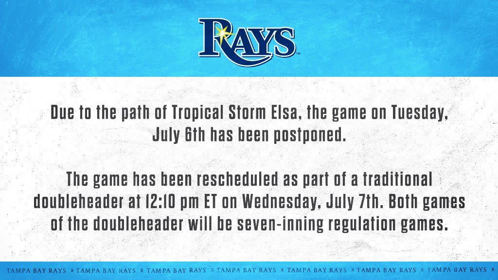 ST. PETERSBURG -- Due to the projected path of Tropical Storm Elsa, the Rays and Major League Baseball announced Monday that Tampa Bay’s game against Cleveland on Tuesday night at Tropicana Field has been postponed.