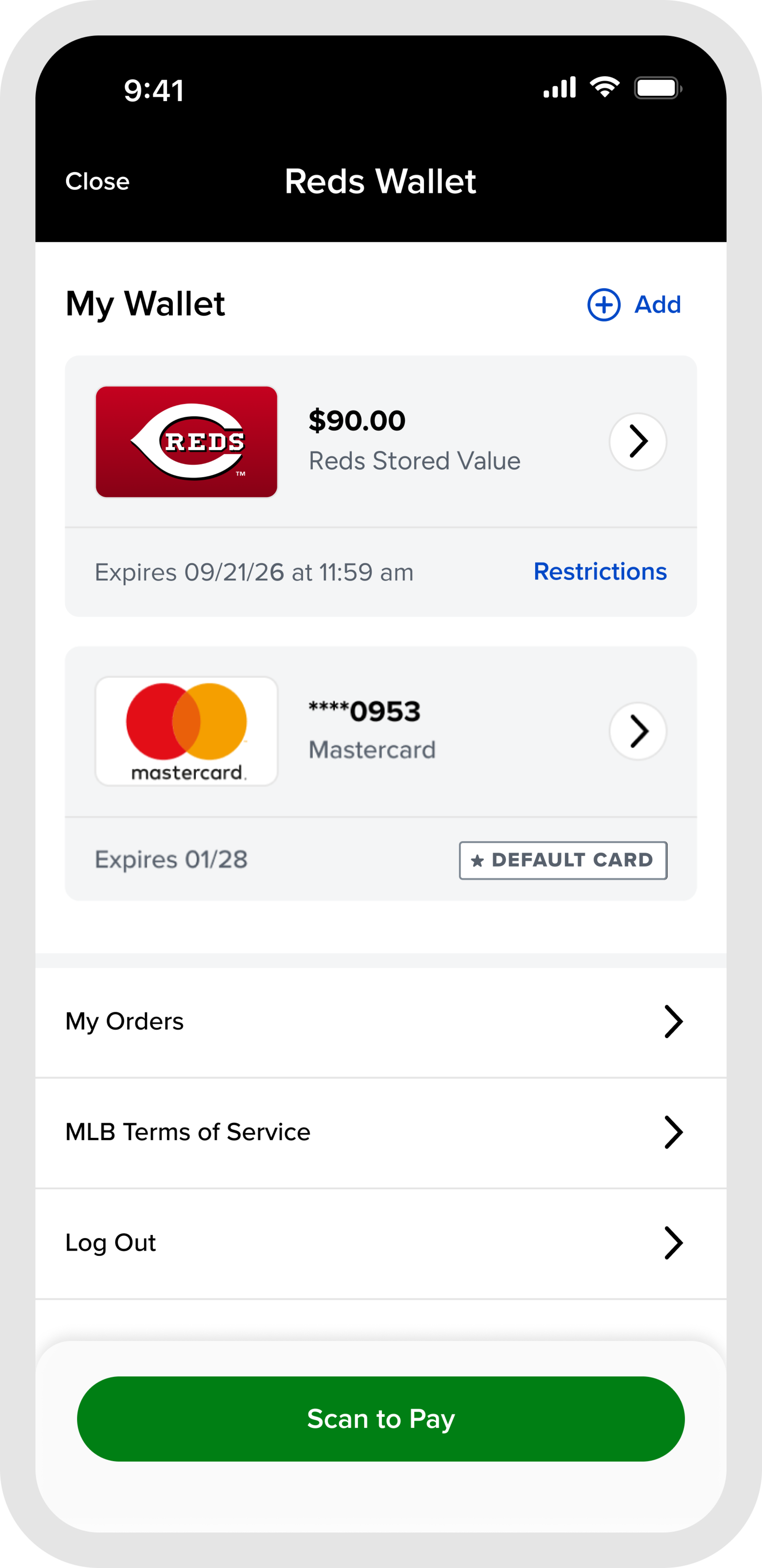 Reds Wallet provides a seamless way for fans to manage their payment methods in one centralized wallet experience. Reds Wallet is available to fans using the MLB Ballpark app at Great American Ball Park concession and retail locations, some restrictions may apply based on the credit. Please see Terms of Use and Privacy Policy for more information.