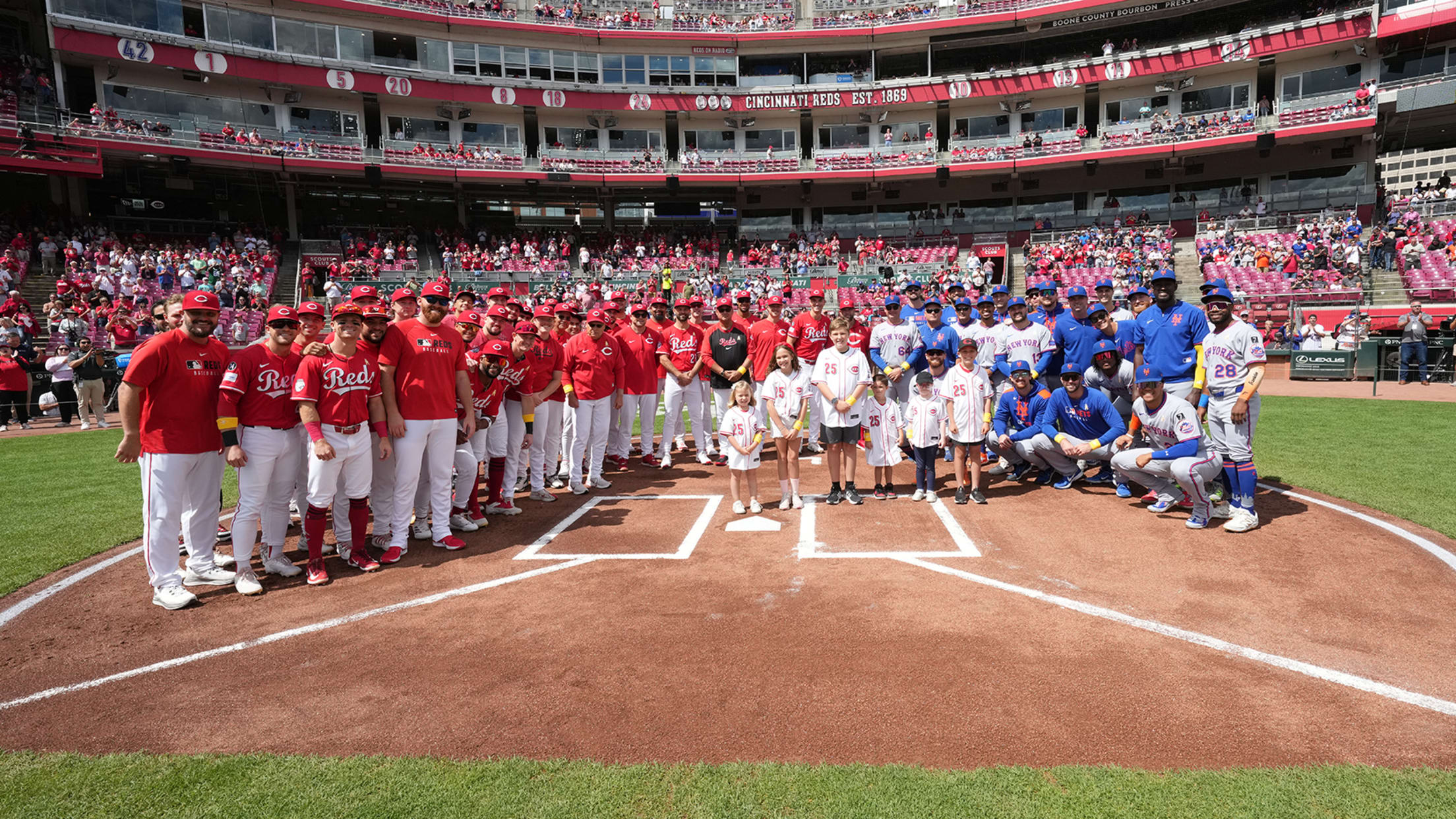 With players and coaches from both the Reds and Mets lining the baselines, six kids either cancer-free or in remission ran the bases, receiving high-fives from the MLB personnel.