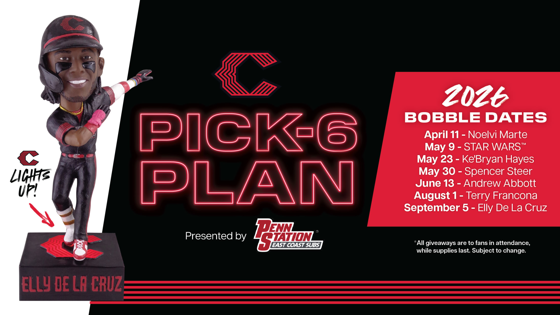 The 2026 Reds Pick-6 Plan includes your choice of any six Reds home games (excluding Opening Day) at a savings PLUS an exclusive Elly De La Cruz "Light Up" bobblehead! With seven bobblehead games, marquee opponents like the Boston Red Sox and Los Angeles Dodgers, the 2026 Reds Hall of Fame Induction Ceremony presented by PNC, and so much more on the schedule to pair with exciting Reds baseball, the choice is yours!