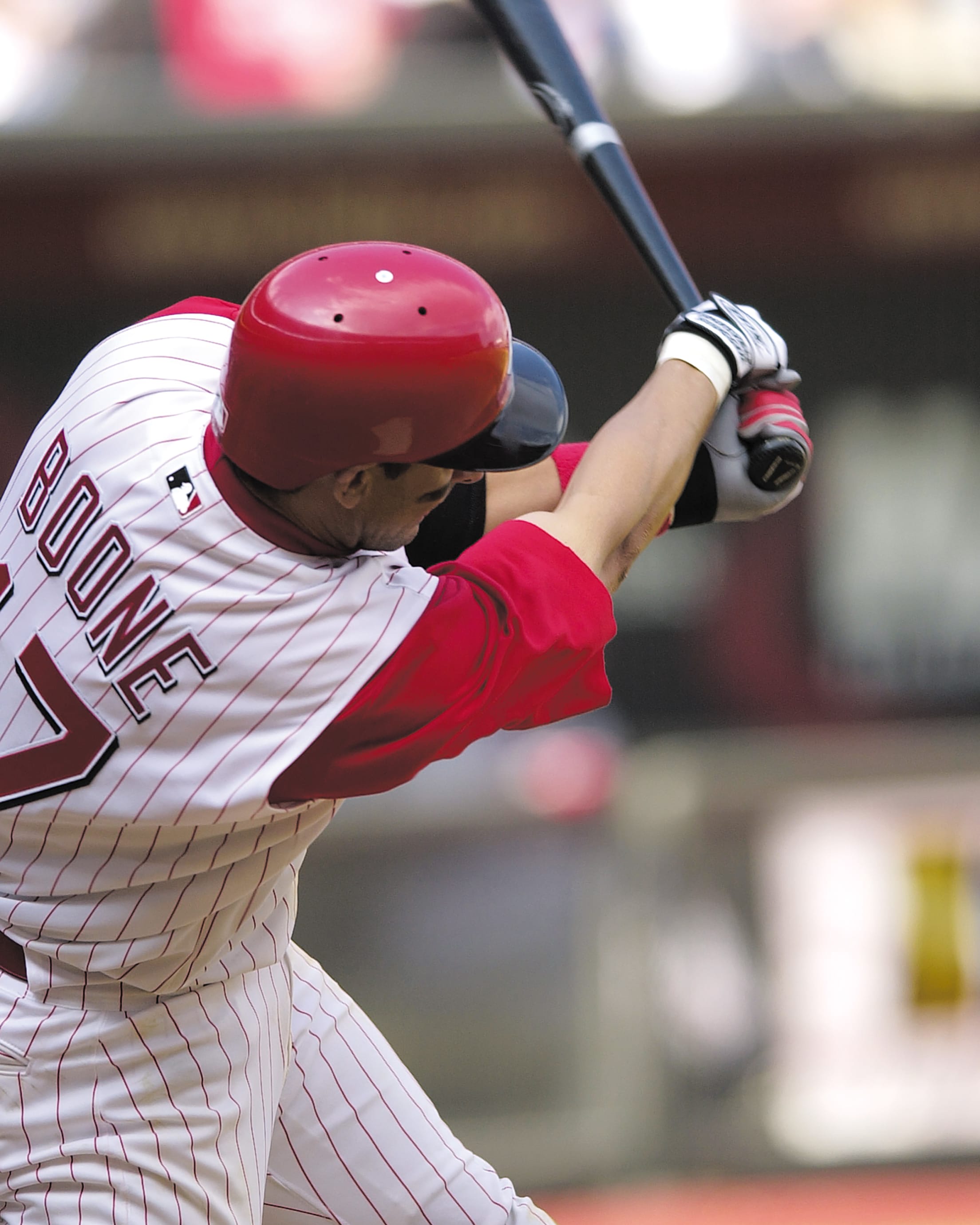 Third baseman Aaron Boone hits the last home run at Riverfront Stadium/Cinergy Field.