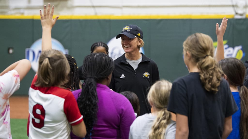 NKU is the only Division 1 softball program in the region, and their head coach, Kathryn Gleason, has had her players helping with fall clinics since 2016. She was introduced to the Reds Youth Academy when it was selected to host the RBI World Series that year. At the press conference announcing the Academy as the site for the event, she met Herb Riley, who oversees the Reds Community Fund’s softball programs and girls fast pitch RBI teams. Riley gauged Gleason’s interest in conducting some weekly clinics, and NKU has done so ever since.