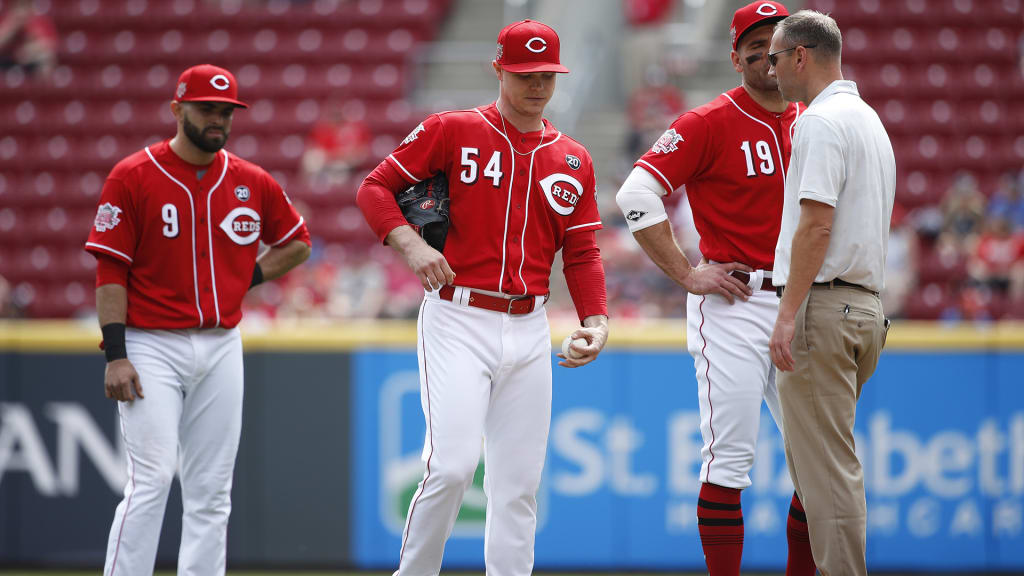 Showing signs of discomfort, Gray was visited at the mound by head trainer Steve Baumann and manager David Bell. But following a warmup pitch, he was able to continue and retired the next eight batters in a row.
