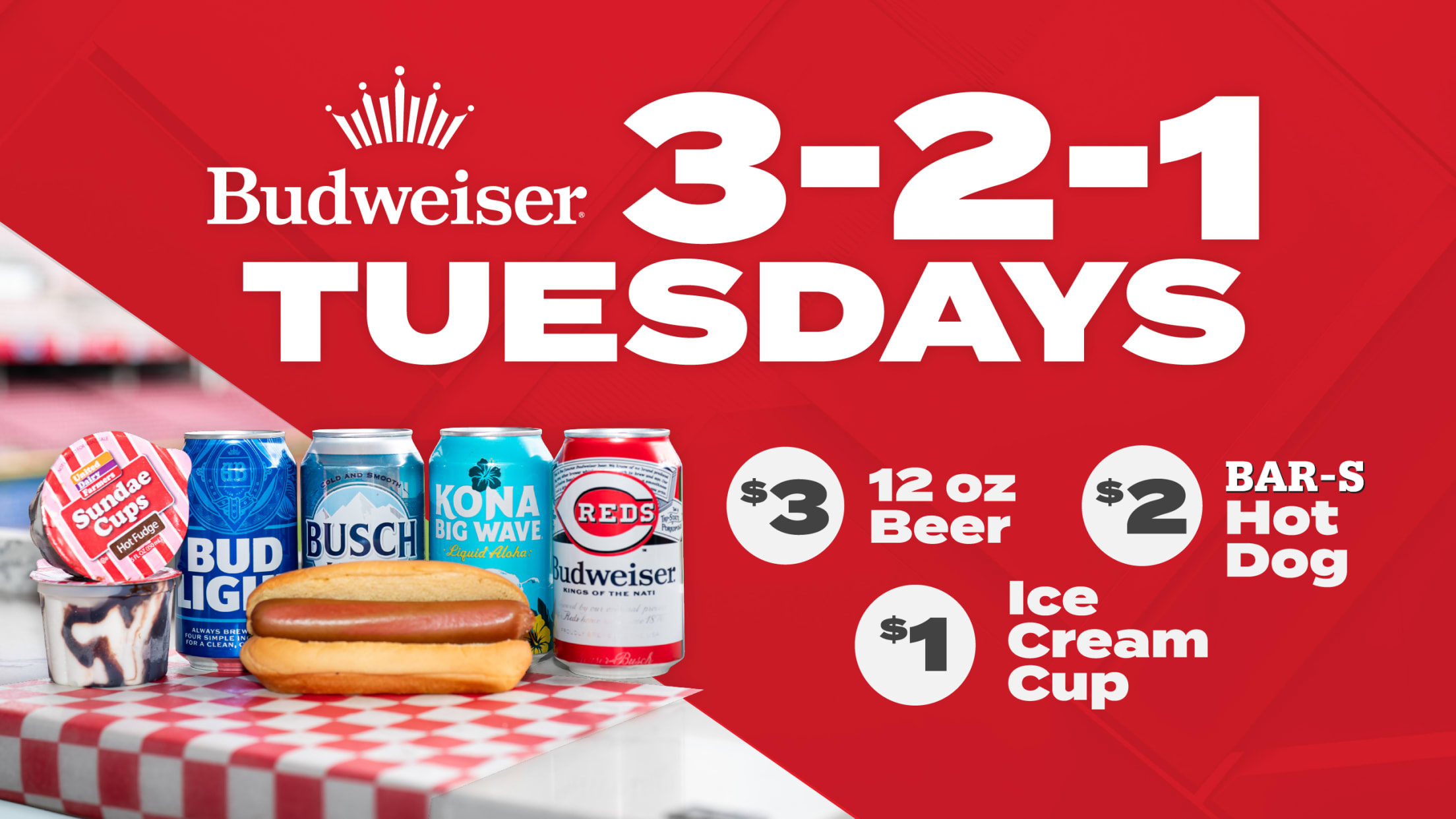 At all Tuesday Reds home games, fans can purchase $3 Buds and Bud Lights (12 oz.), $2 Bar-S hot dogs and $1 ice cream cups. Limit two items per person per transaction, while supplies last.