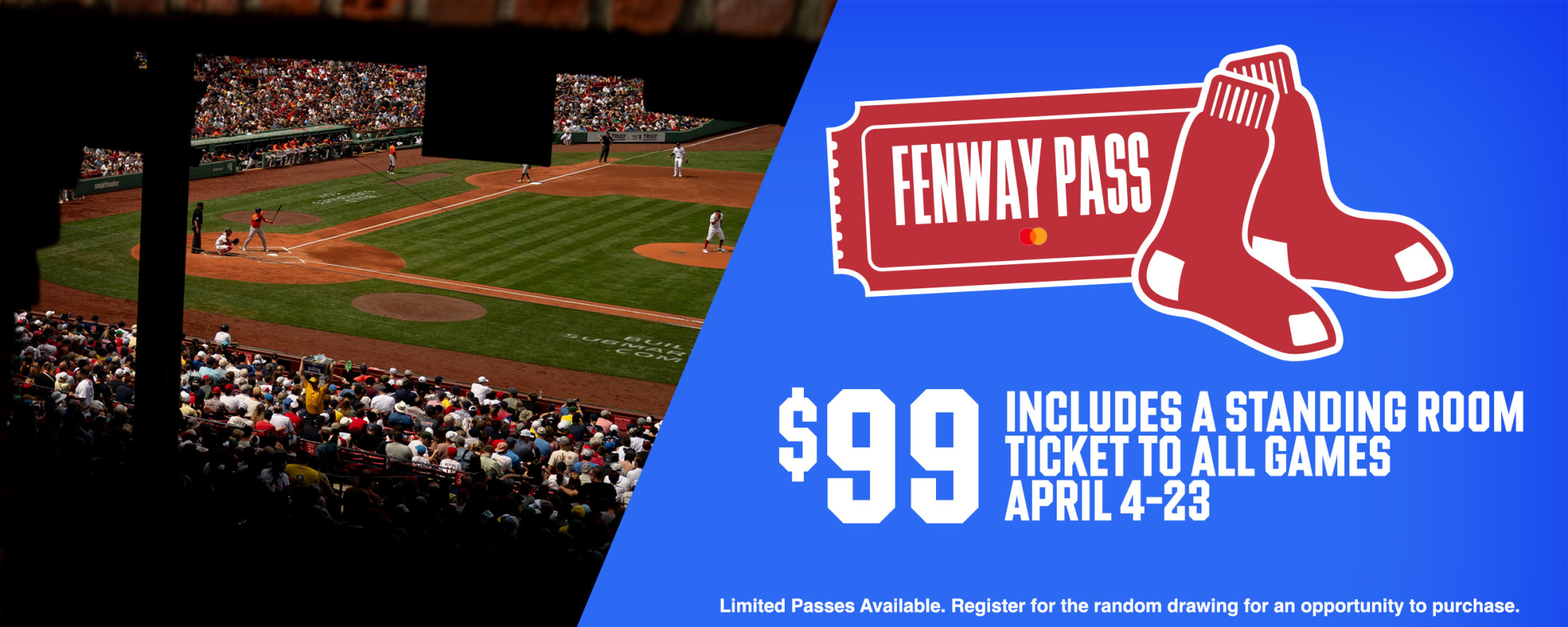 The Fenway Pass includes a lower-level standing room ticket for all games from April 4-23 for $99. Don't wait! Registration ends on Sunday, March 22, at 5 p.m. ET.