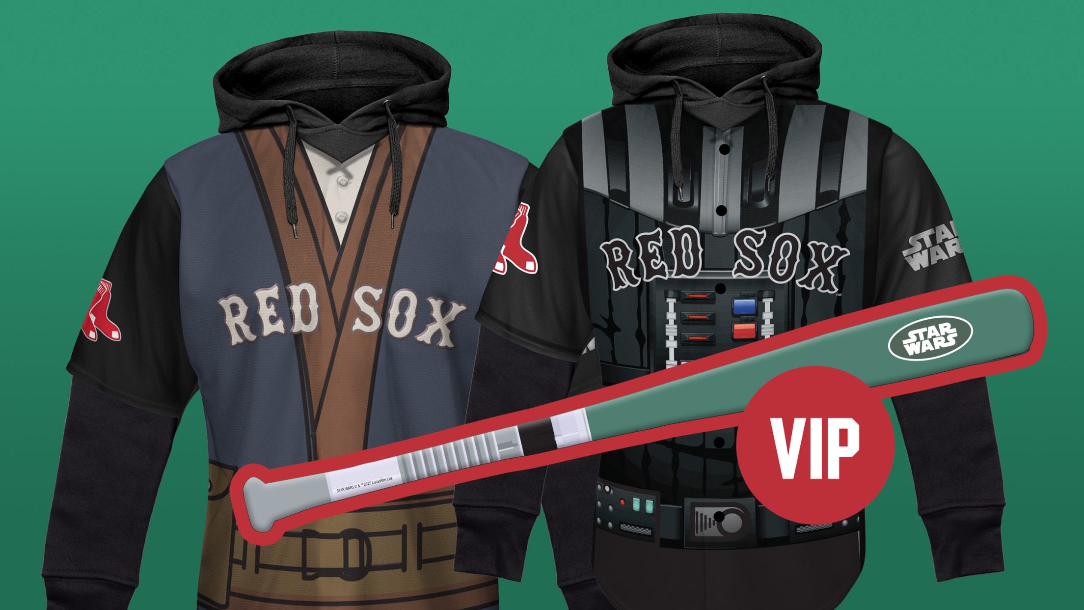 Ticket holders who purchase through this special offer will receive a random Sith or Jedi themed Red Sox hooded long sleeve jersey. This jersey will be available in sizes Youth Large, Adult Medium or Adult XL, with sizes distributed on a first-come, first-served basis. Sith and Jedi jerseys will be distributed randomly to fans with a regular theme ticket.