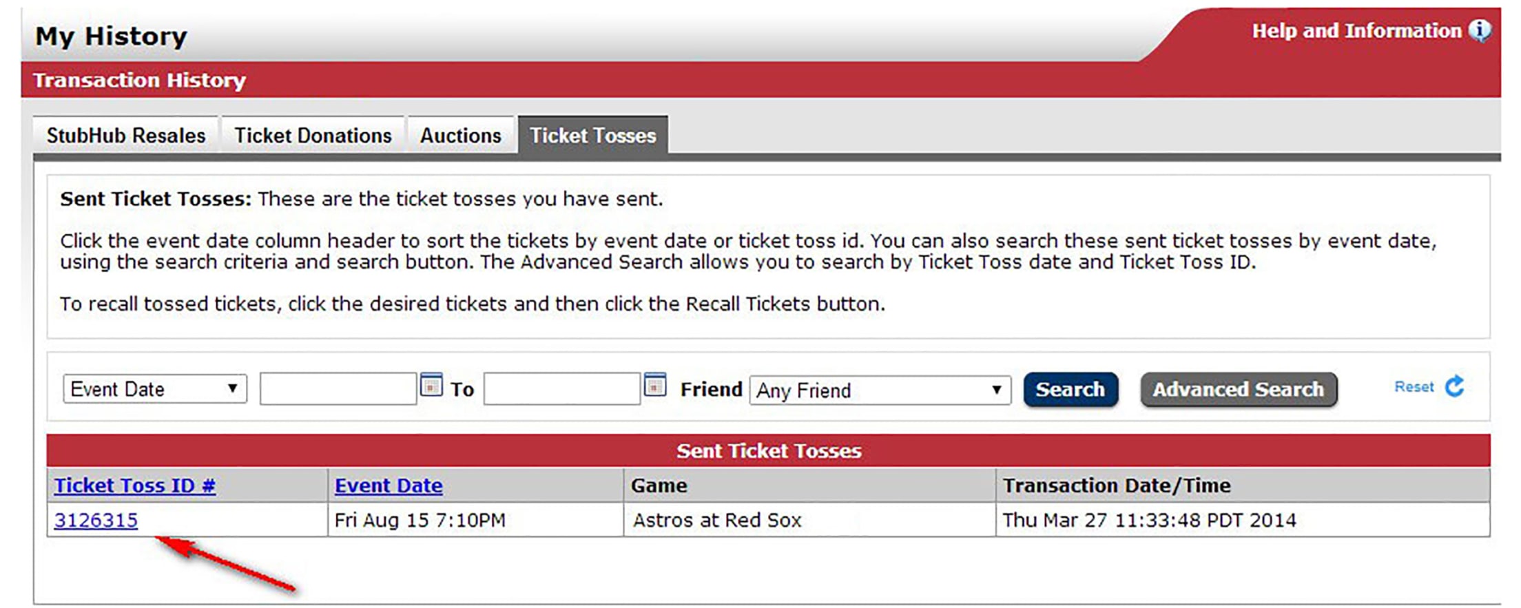 1. Click the My History tab, choose Ticket Tosses and click the Toss ID that contains the ticket(s) you want to recall.