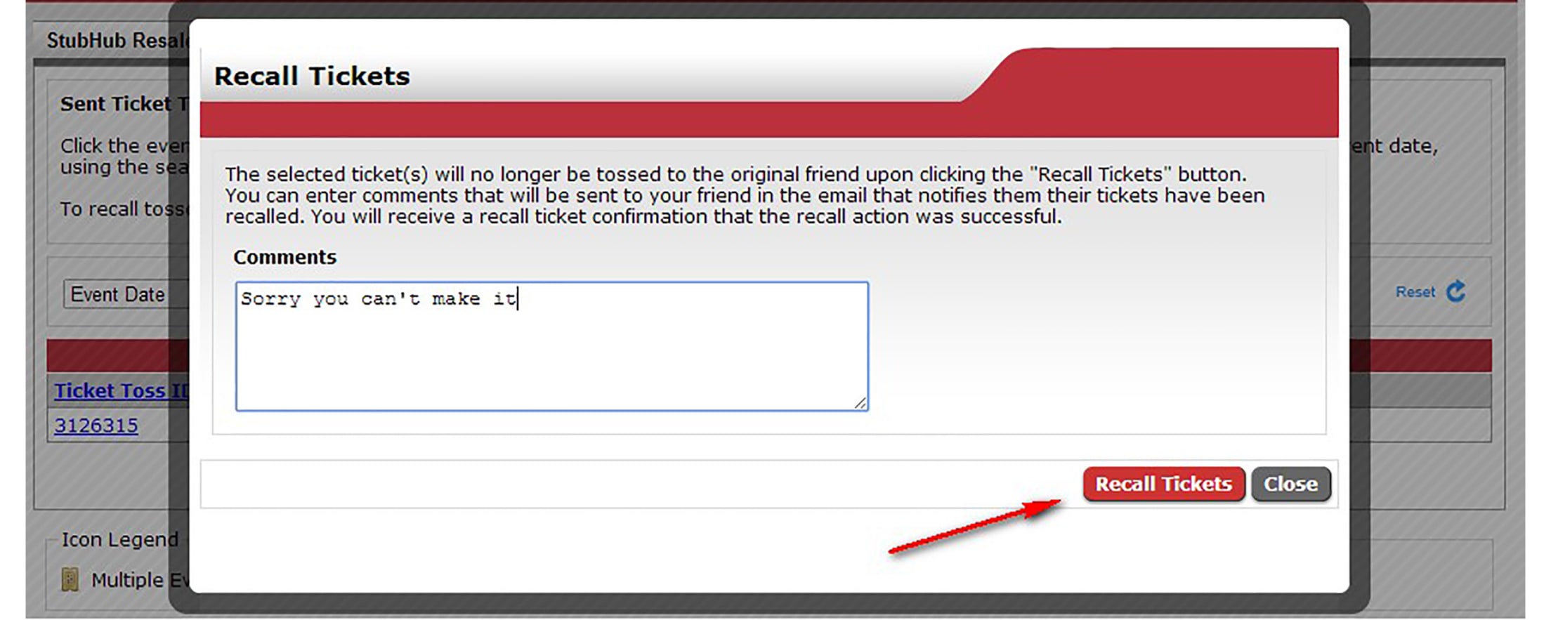 3. Enter a message to your friend, and click Recall Tickets to complete the Recall. You will now have access to take actions on this recalled ticket in your My Ticket Inventory tab.