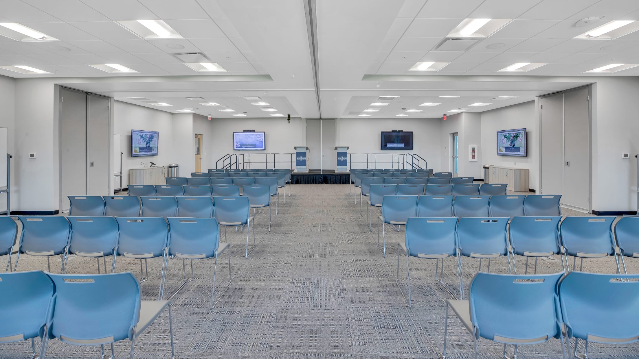- Capacity of 200 theater-style and 76 classroom style (with stage setup) when used as one large meeting space
