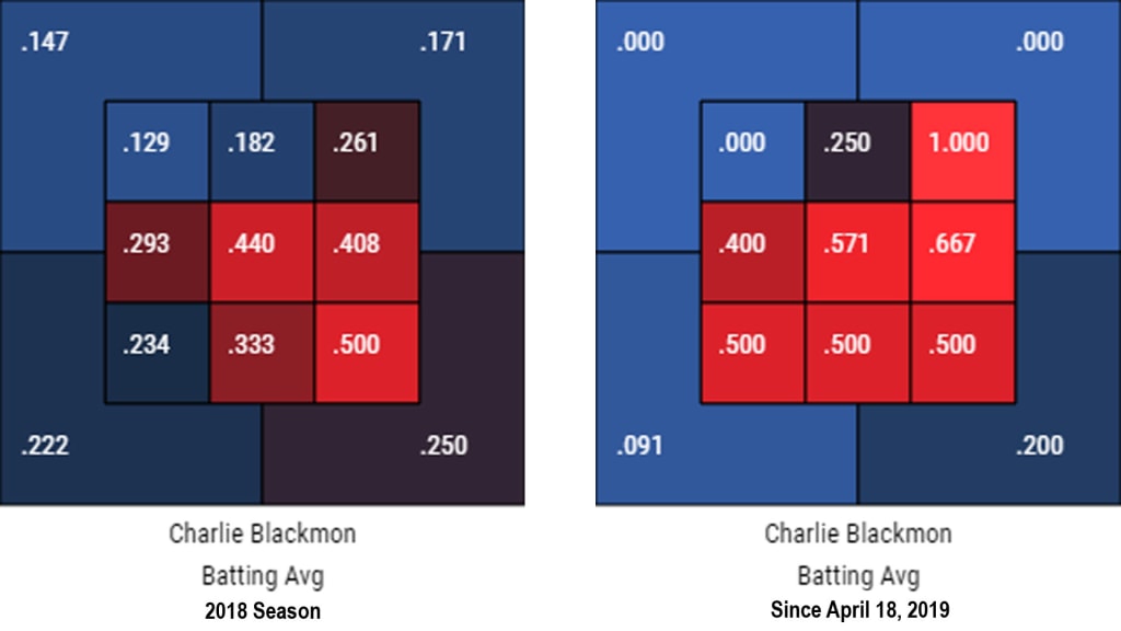 1) Know thy strike zone: The following charts from the catcher's perspective, comparing Blackmon’s 2018 with his current hot streak, show that Blackmon has increased the number of areas that are considered “hot zones.”