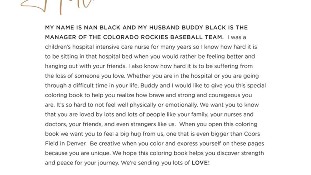 To a child dealing with serious illness, a coloring book is an important part of healing -- and these days, that kind of healing is in high demand. Thanks to a $10,000 donation from Black and his wife, Nan, to River + Pearls, a nonprofit based in Fort Collins, Colo., kids at many hospitals will receive the popular "My Journey" coloring book, which was designed as art therapy for children who may be weakened from treatment.