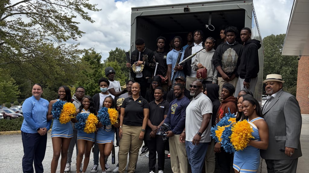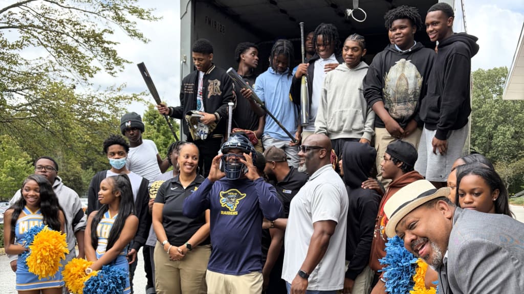 ATLANTA -- As Termarr Johnson and Xzavion Curry walked out of Benjamin E. Mays High School’s main building earlier this week, students on the baseball team and cheerleading squad followed. Outside, a large truck sat at the curb. Johnson and Curry, two Mays High alums, stopped behind the truck and the students gathered for the big reveal.