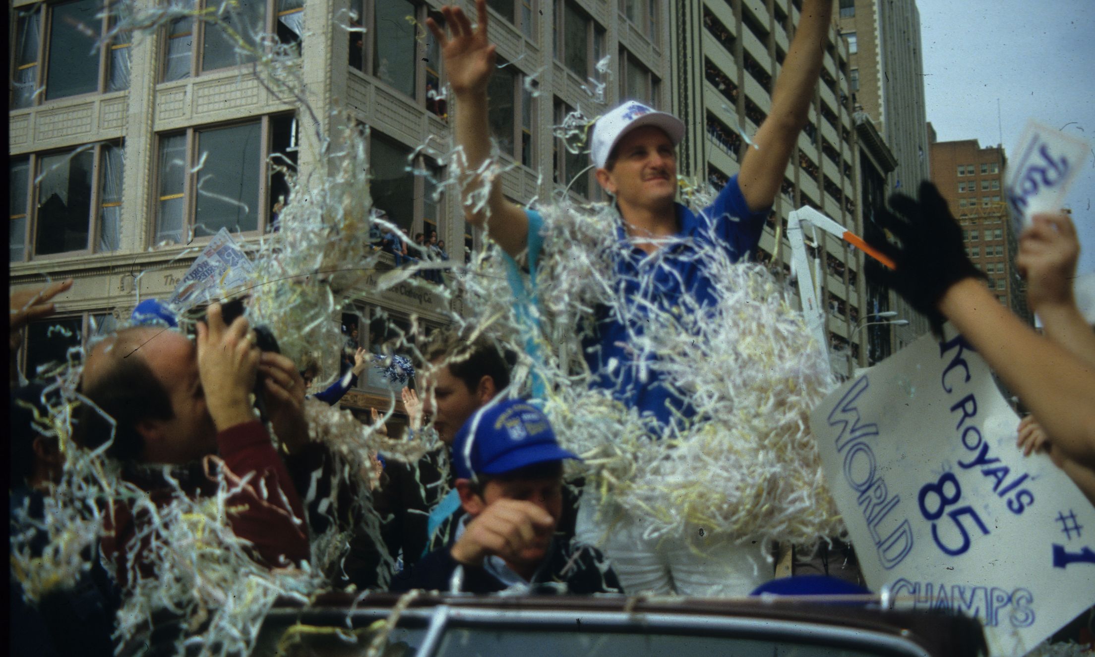 Right-hander Bret Saberhagen is seen here celebrating with Royals fans during the victory parade.
