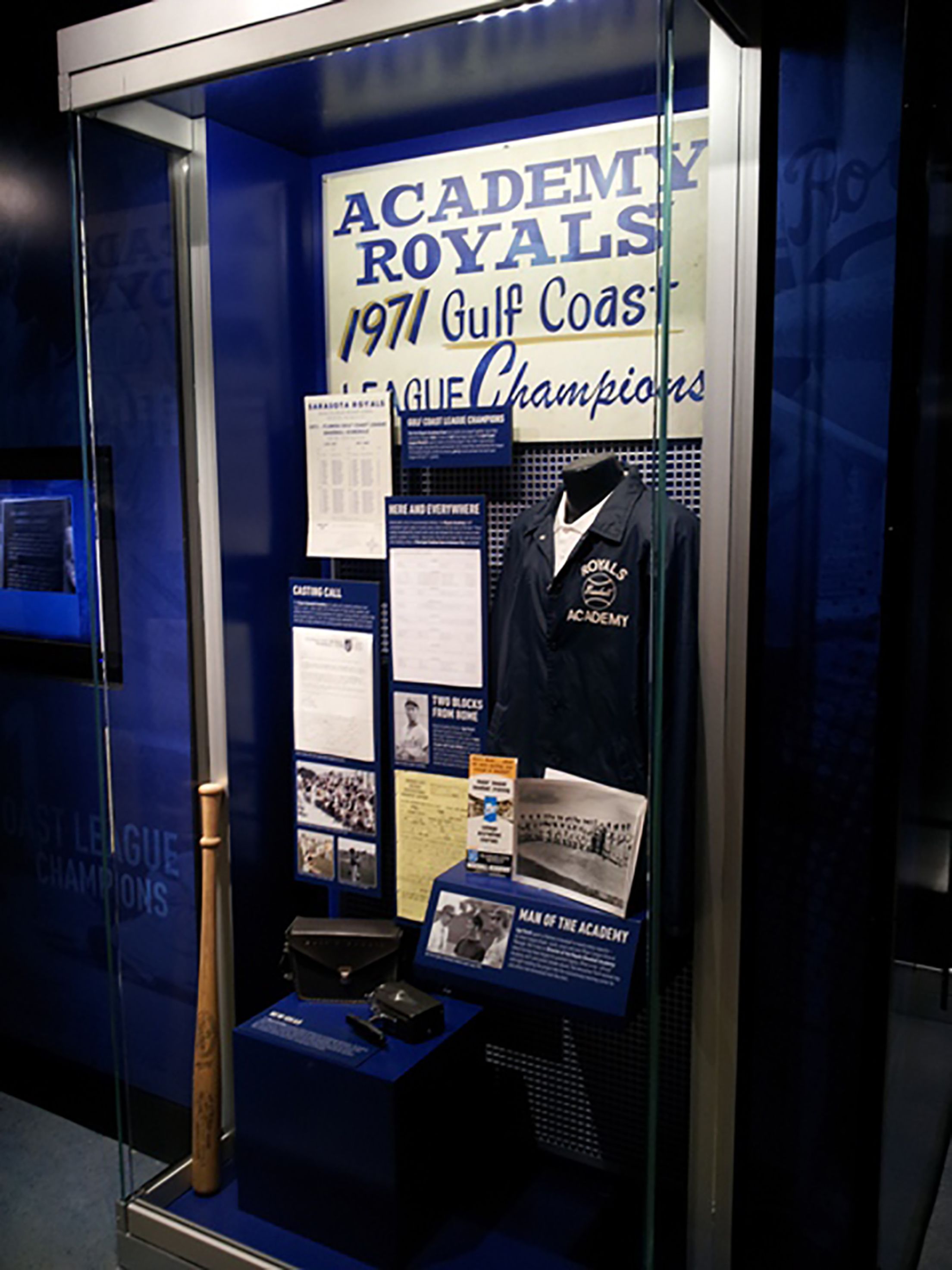 A display of artifacts from the Royals Baseball Academy. - Royals