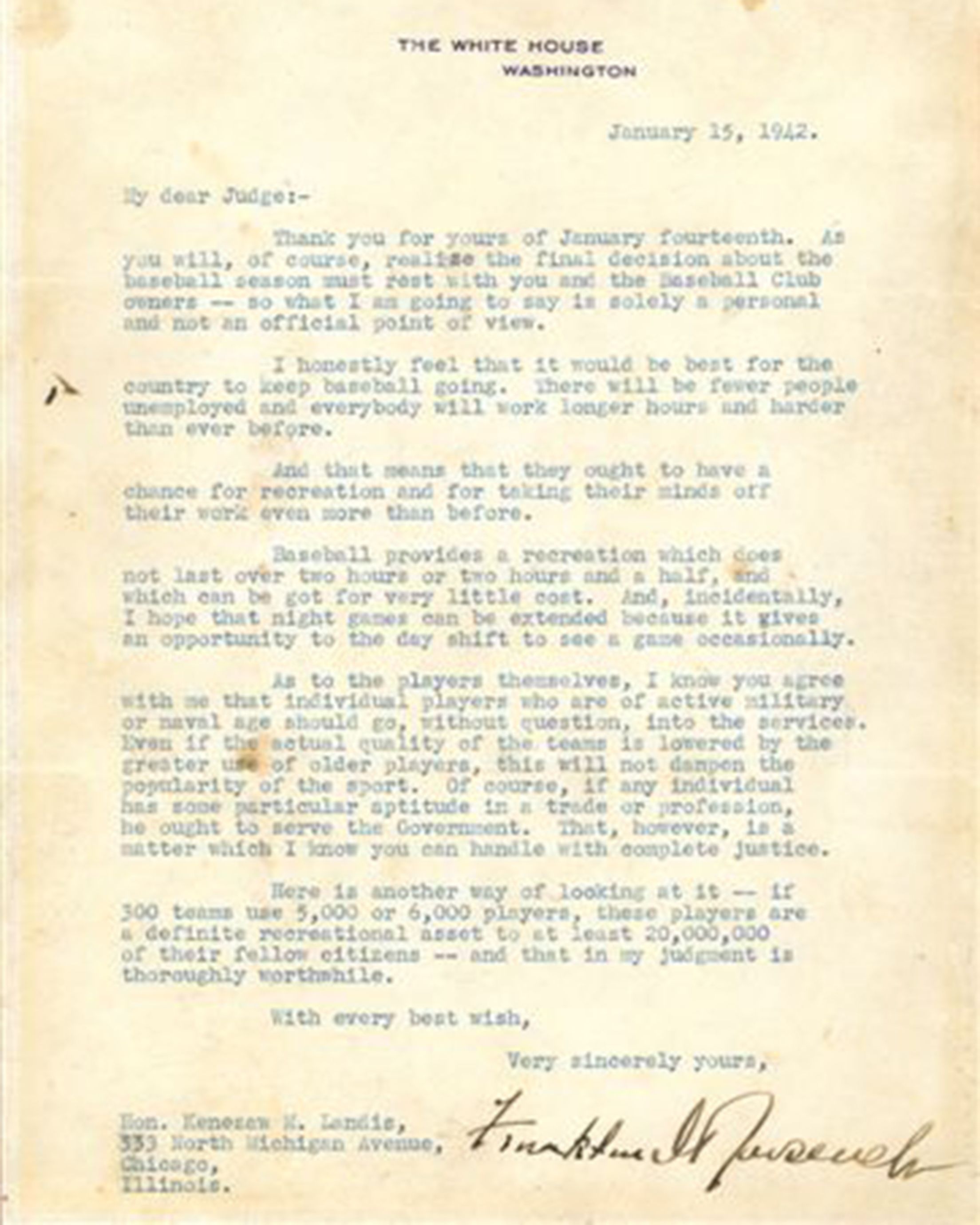 President Roosevelt's famous Green Light Letter to Commissioner of Baseball Judge Kennesaw Mountain Landis kept the game going during the war effort. The president stated his feeling succinctly, "I honestly feel that it would be best for the country to keep baseball going."