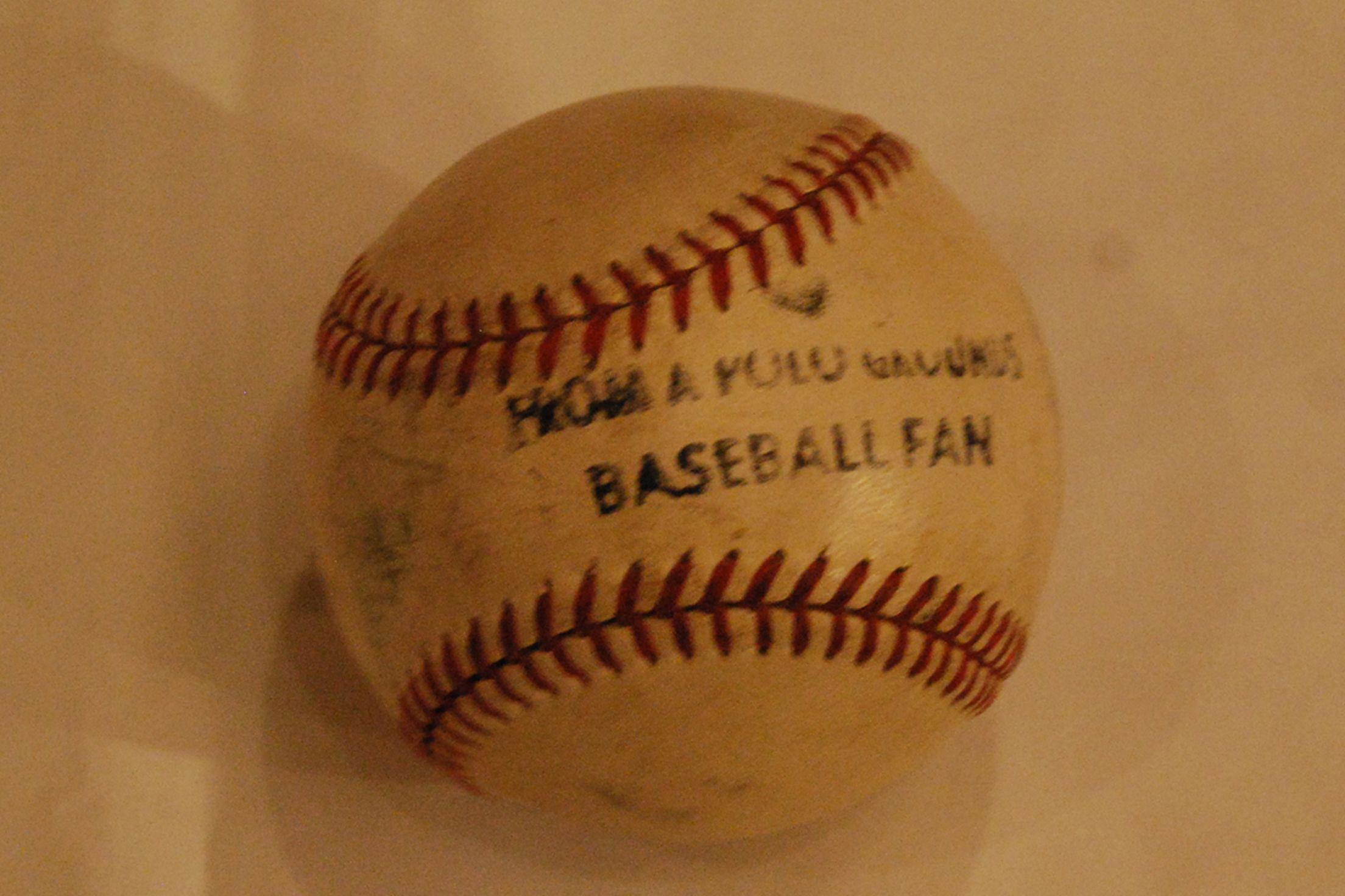 This baseball was one of many donated by fans at the Polo Grounds in New York to be sent to troops overseas so they could play baseball.