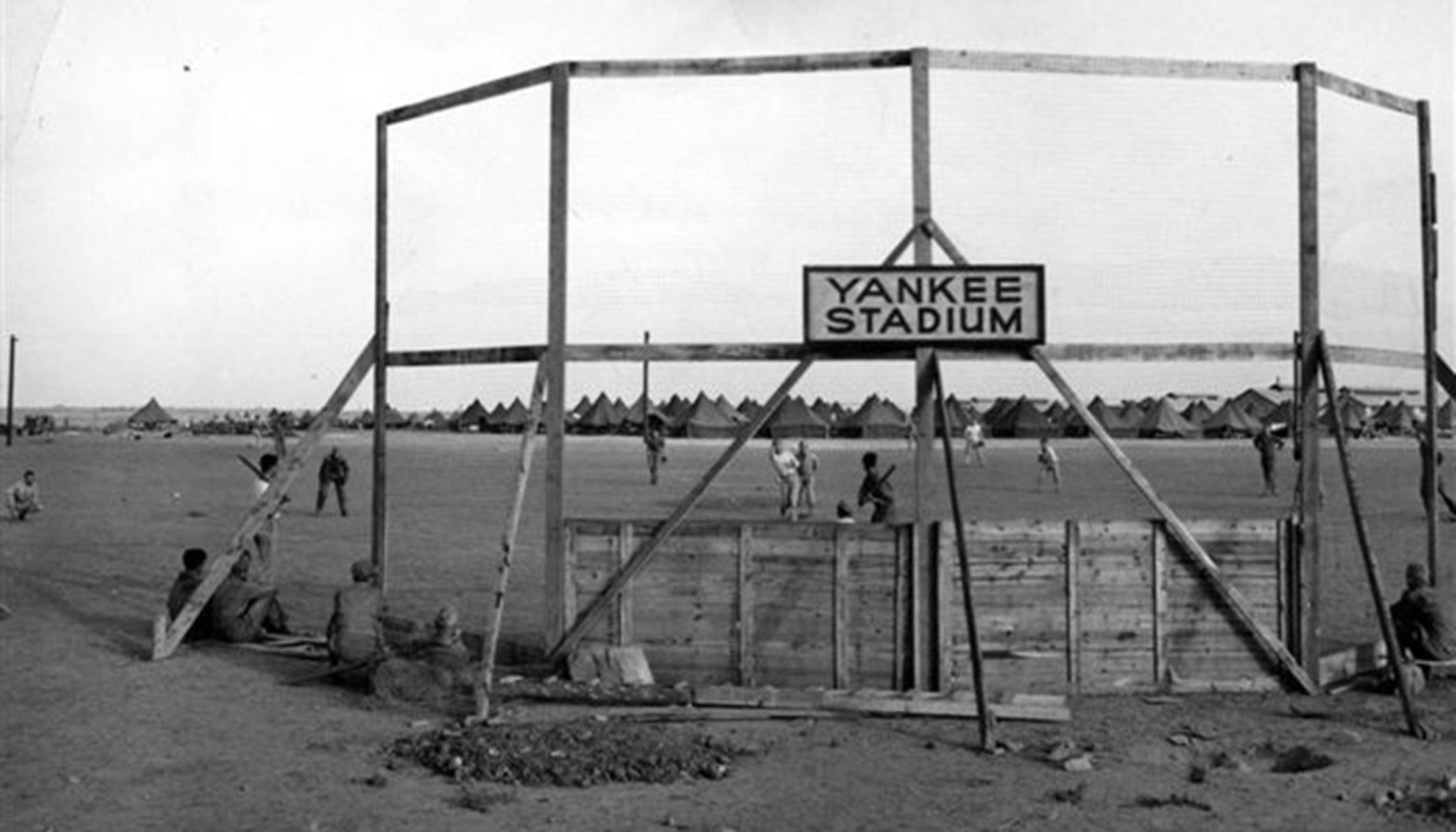 Baseball didn't literally go to war, but servicemen did take the game to war with them. In North Africa, soldiers constructed their own makeshift Yankee Stadium.