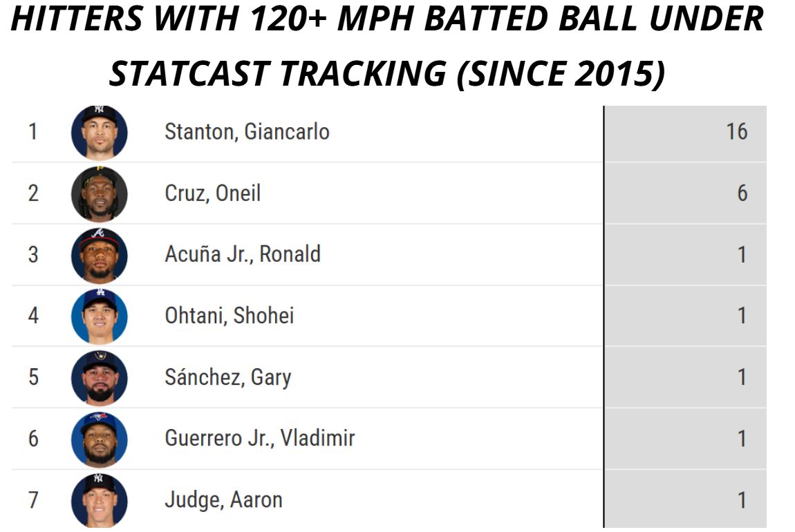 Most hitters never get close to that range. During the Statcast era (since 2015), only seven players have hit a ball that hard in games that count, and Giancarlo Stanton and Oneil Cruz are the only hitters to do it more than once.