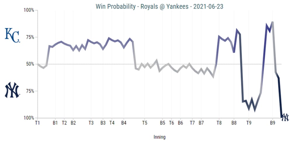 The Royals had a 42.3 percent chance of winning even after Sánchez's two-strike home run off Holland tied the game. But then Stanton singled on a sharp ground ball to right field and pinch-runner Tyler Wade took second on a wild pitch. Holland attacked Voit with five sliders in a row, three of which the Yankees' first baseman fouled off.