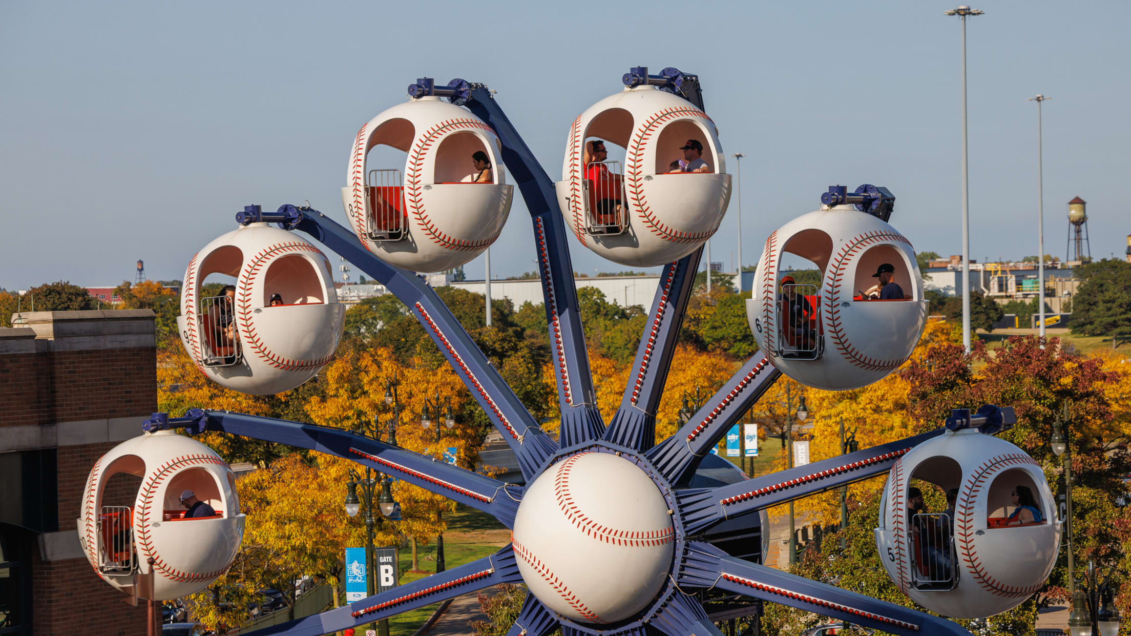 Located on the third base side of Comerica Park in the Brushfire Grill, behind Section 131, this 50-foot Ferris Wheel features cars shaped like baseballs that can seat up to five passengers and is wheelchair accessible.