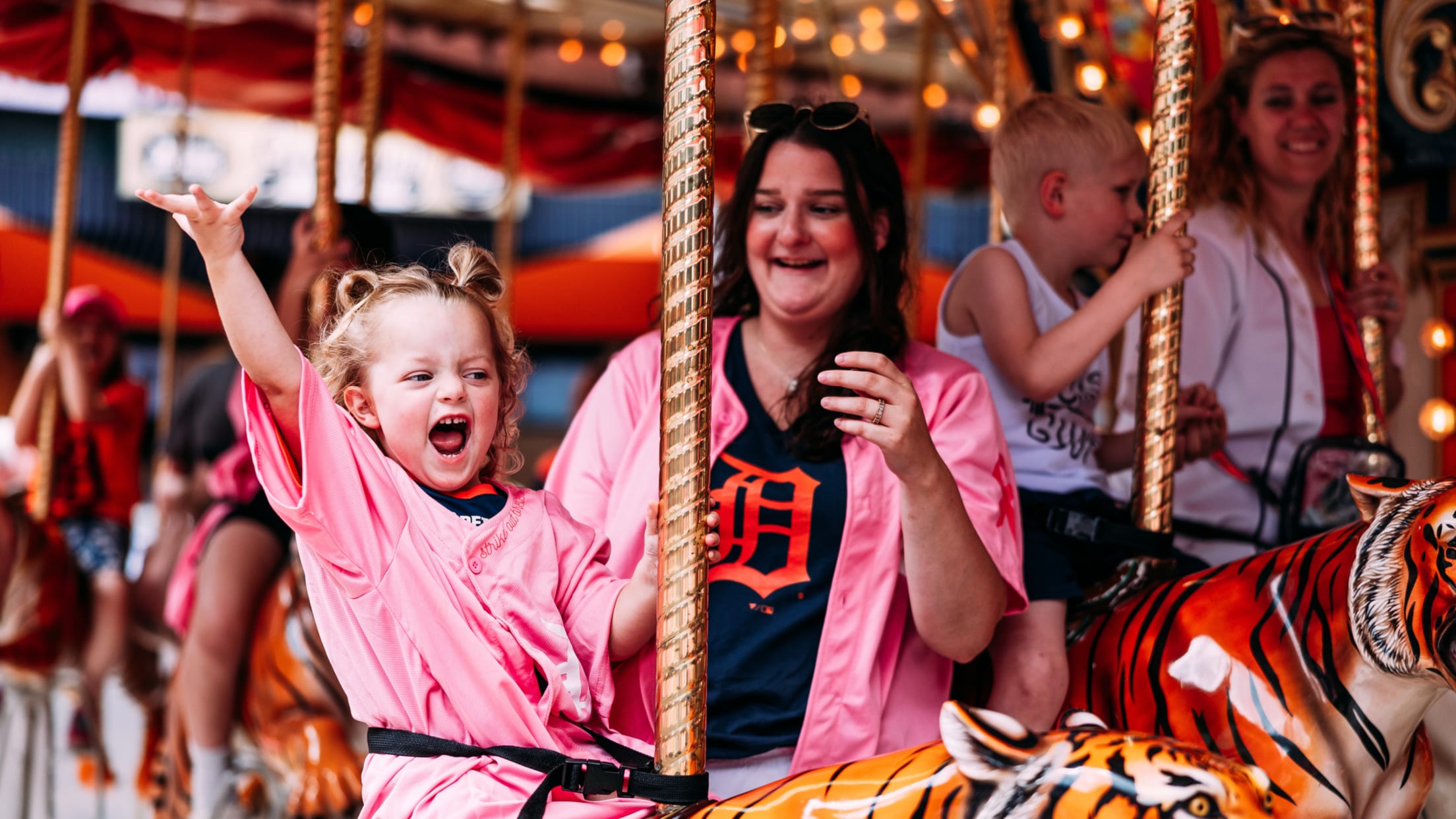 The Hi-Chew Carousel is in the Comerica Bank Big Cat Court next to Comerica Entry (Section 119). Children, young and old, can enjoy riding atop decorative tigers on this one-of-a-kind carousel for $2 per person. On Sundays, kids aged 14 and under ride free. Comerica Park is a cashless venue.