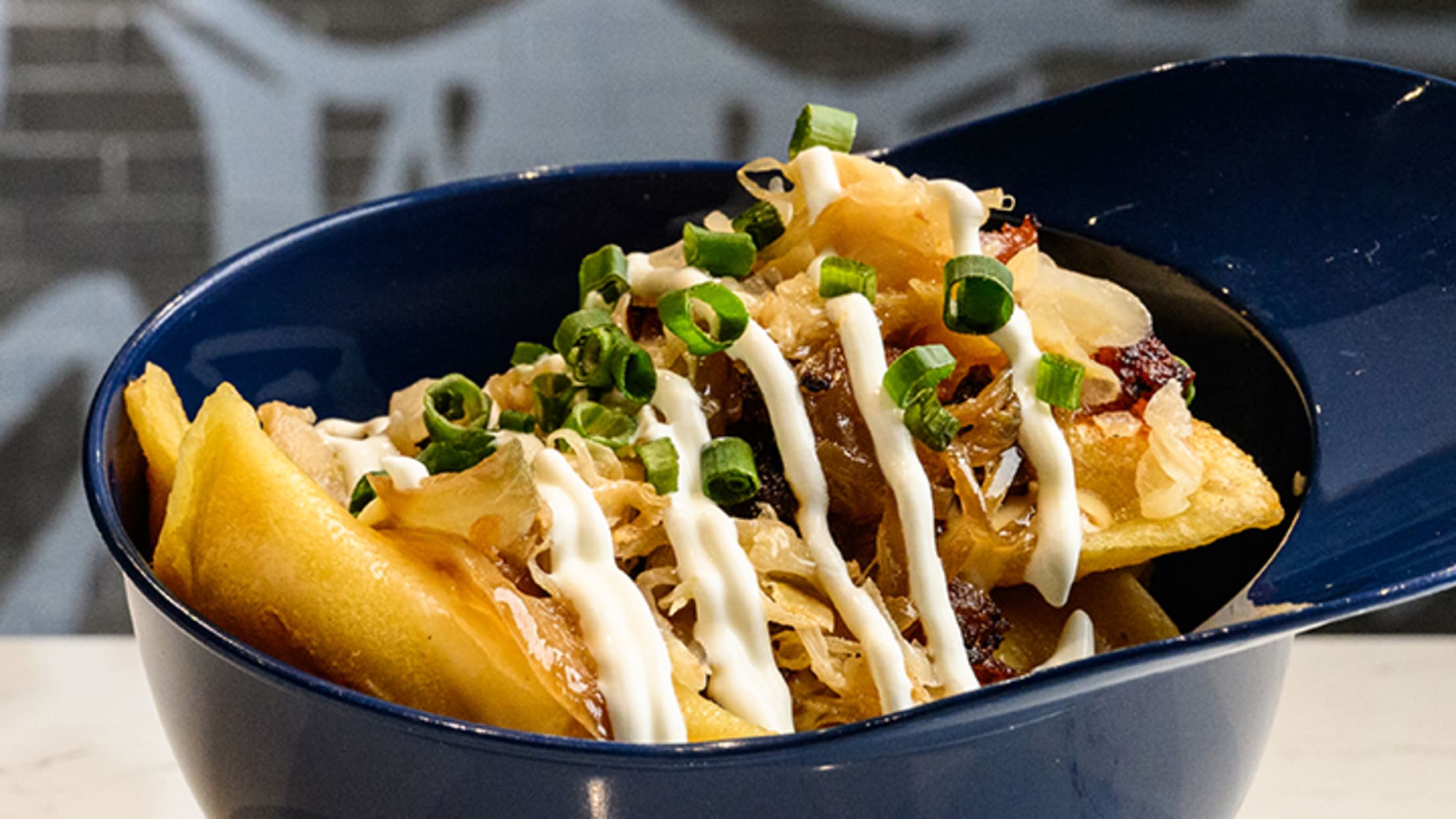 Potato and Cheddar Pierogi w/ Hatch Chili Queso, Polish Kielbasa Crumbles, Caramelized Onions and Sauerkraut