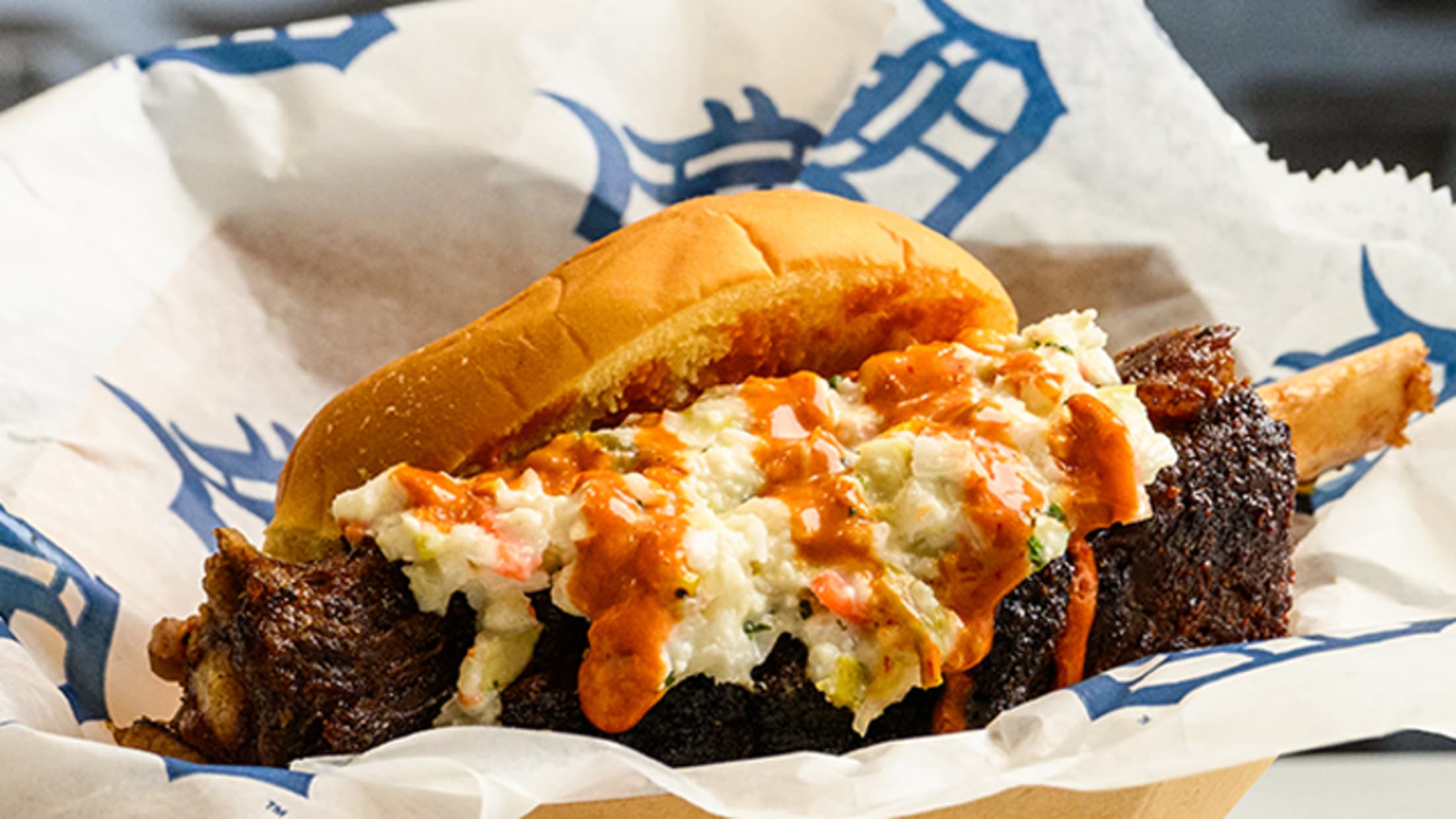 Slow Smoked Bone-In Short Rib, Elote Slaw, BBQ Mayo, on a Martin’s Potato Roll