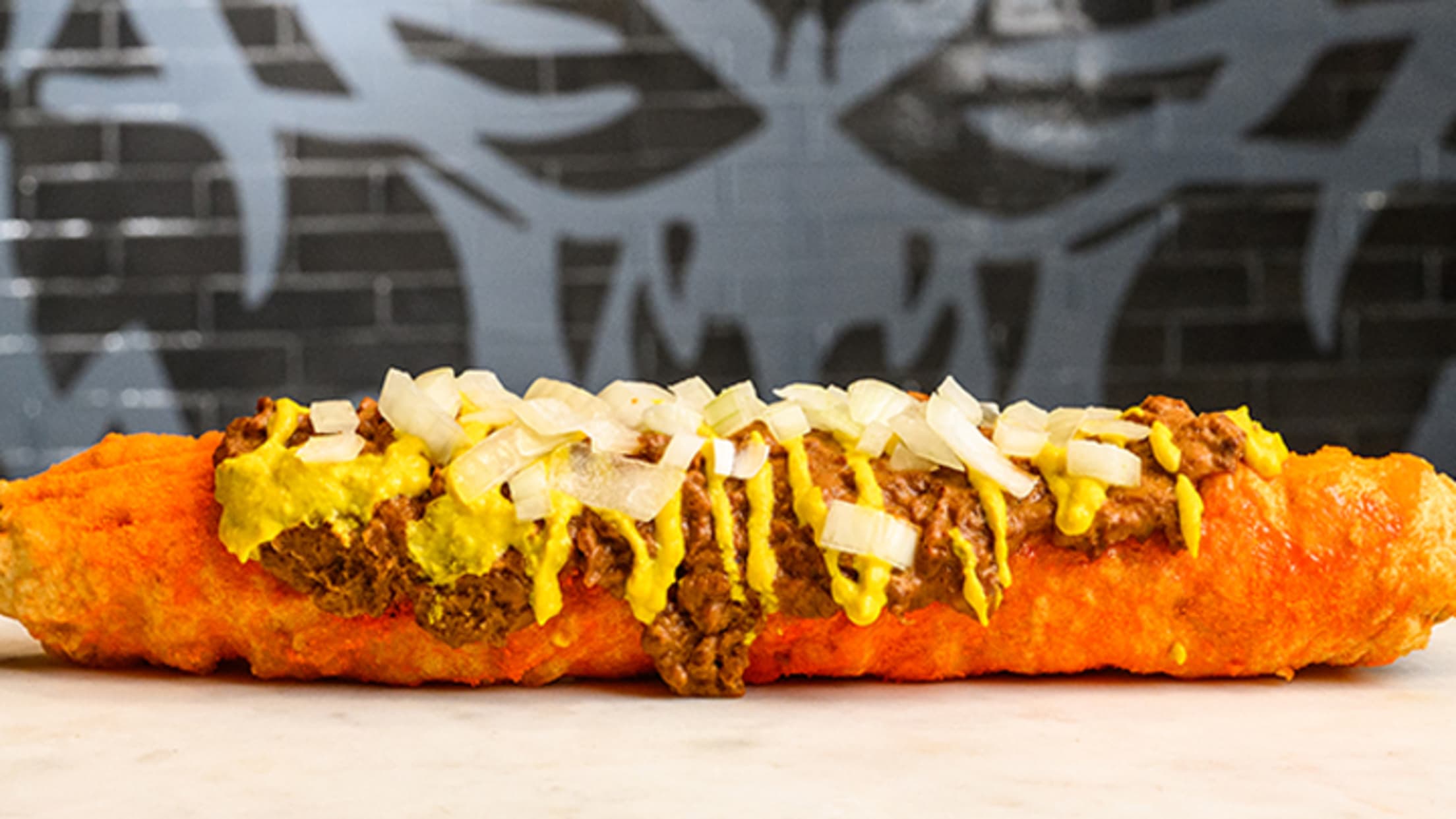 Footlong Corn Dog, Hand Battered, Rolled in Cheese Powder, Topped w/ Coney Chili, Orange Mustard and Diced Onions