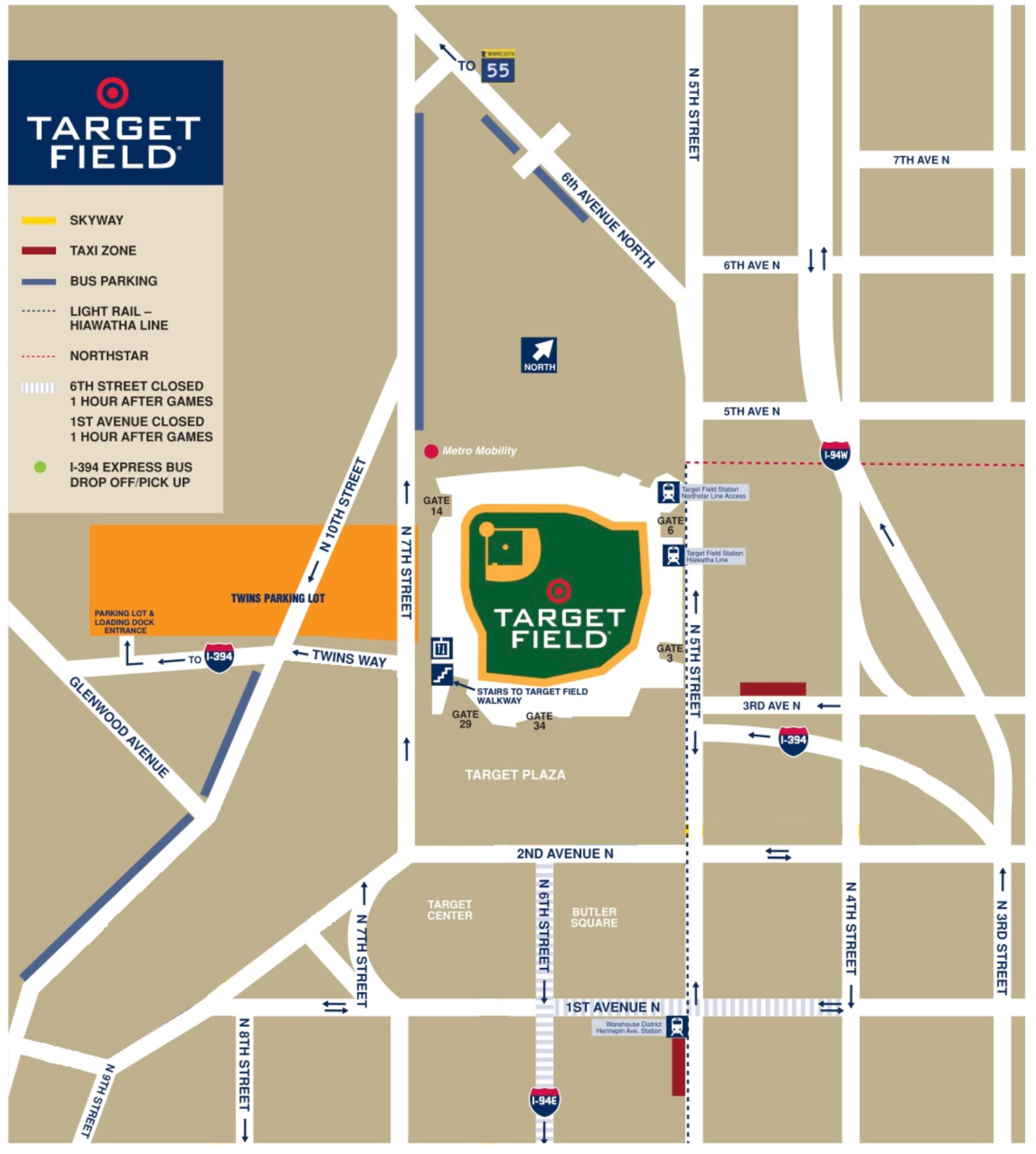 FROM THE NORTH: Travel southbound on I-35 and follow I-35W at the divide. Merge into I-94 West and exit on Olson Memorial Highway (Highway 55). Turn right (East) after exiting then another right onto North 7th St. North 7th St becomes 10th Street North. Make a right onto Twins Way and stay in the far right lane. Target Field Parking Lot and Loading Dock Entrance is on your right.