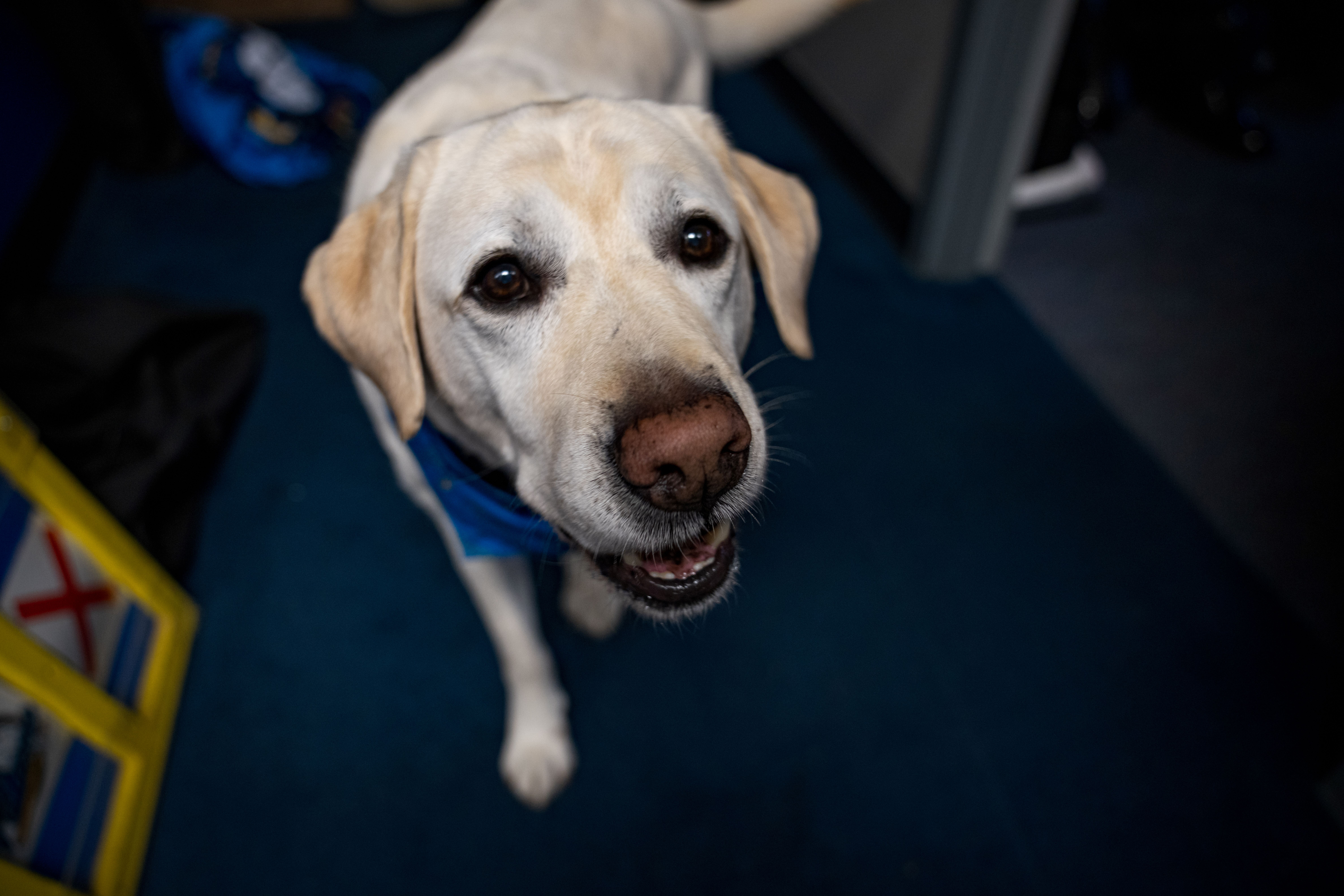 Once the rain subsided, I ventured out of the men's room and into the front office area. Slider the bat dog was hanging out in one of the offices, seemingly unperturbed by the evening's turn of events.